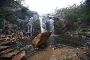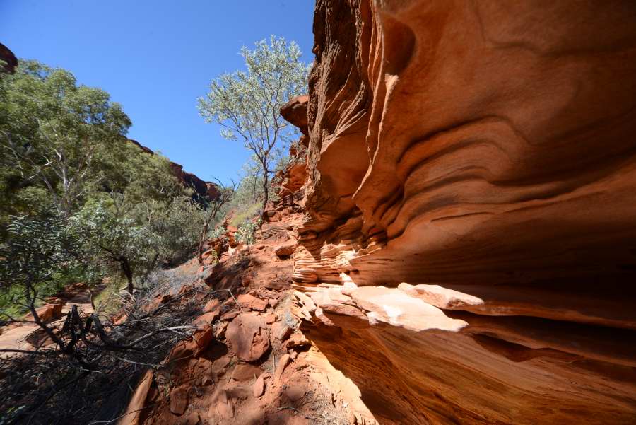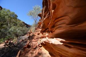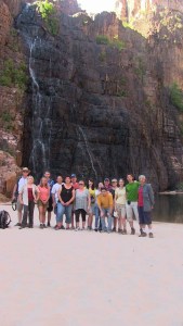 Rock Climbing till you drop! We couldn’t get going until 7:20 a.m., because it takes time for 16 people to pack their lunches (sandwiches). The trailer with the luggage stayed in camp and we drove over bumpy off-road paths, through streams and even through a (80 cm deep and 20 m wide) river to Twin Falls. Here we could not go swimming – crocodiles! However, we didn’t see any. We were too busy at the edge of the shore to do gymnastics over rocks. You have to hold on with your hands all the time. Absolutely not a trail for flip flop walkers (although we did see some people walking barefoot!). The pool and the falls with its snow-white sand bar made up for all the pain. The waterfalls didn’t have much water – dry season. Then climbing back all the way!. When we finally had made it back to the car, we went straight on to the most strenuous climb: Jim Jim Falls. Had I been on my own I would have just kept going!. Some parts were almost like free climbing. However, at the end there was a fantastic natural swimming pool with warm, clear water waiting for us. Unfortunately, the falls had no water. Then we climbed back again. A family with a little boy was there – the kid jumped like a rock wallaby over the rocks. Wish we could! This night we stayed at the Gunlom Bush Camp. Dinner was cooked over the campfire. We had the choice of swag (sleeping bag without a tent) or a type of mosquito net over the sleeping bag. Expecting mosquitoes, dingoes and whatever else might be crawling around there, we and two other couples chose the mosquito tent. But even so, you have the feeling you are outdoors. Wonderful! Only the stars were not so bright because of the (full) moon glowing like a flashlight in my face. You needed no other light to find something in your backpack. Dingoes howled at night, cockatoos and bats screamed. You realized that you were in the bush. Nevertheless, it was a good night.