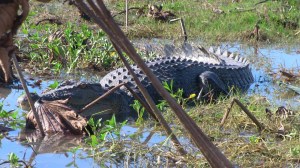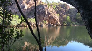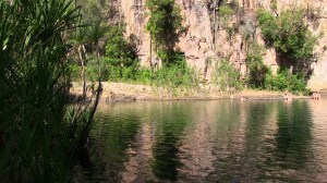 Und es gibt doch Krokodile hier! Am morgen können wir wählen zwischen einer Bootsfahrt, schwimmen, laufen, Kajak oder Helikopter – je nachdem, wie viel man sehen will. Bei einem Spaziergang zum Lookout sehen wir von oben ein Krokodil durch den Fluss schwimmen, in dem gerade 2 von unserer Gruppe paddeln und andere Leute schwimmen. Süßwasserkrokodil – harmlos (sagt man). Ich bin trotzdem froh, dass ich danach in einen richtigen Boot sitze. Nach einem Lunch im Freien, bei dem alle Reste an Salat, Hähnchen, Tunfisch und Brot gegessen werden, fahren wir zurück nach Darwin. Uns ist nach Duschen und sauberen Kleidern. Man braucht schon eine Bürste, um den Staub abzukriegen. Abends treffen wir uns noch einmal (fast) alle in der Bar des Monssuns in Darwin, um über die schönen Tage zu reden, uns bei unserem netten Guide zu bedanken, uns zu verabschieden und Emailadressen zu tauschen. Ereignisreiche Tage liegen hinter uns. Der Hauptinhalt Rockclimbing und Schwimmen in Felsenpools. Manches ging hart an unsere Grenzen. Aber im Rückblick ist es ein schönes Gefühl, das geschafft zu haben. Diese Tour mit Adventure Tours ist auf jeden Fall zu empfehlen – aber nur für Leute mit guter Kondition und Ausdauer, die keinerlei Laufprobleme haben. Gute rutschfeste Schuhe sind ein Muss, ebenso wie ein hochdosiertes Mückenmittel („Bushman’s 80% – auch in der Trockenzeit!) und eine Sonnencreme mit hohem Lichtschutzfaktor. Auf jeden Fall nützlich: Stirnlampe.