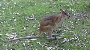 Der Morgen nach der Great Ocean Road gleicht dem Weltuntergang. Es schüttet was vom Himmel kommt. Trotzdem: die Wale will ich sehen. Am Logans Beach schließen sich die Schleusen wie durch ein Wunder und es bleibt genau für die halbe Stunde trocken. Ein paar Riesenwale mit Jungen schwimmen fast am Ufer lang – kurz bevor die Wellen brechen – und davon ein Surfer… Manche Leute sind schon freakig. Zudem noch bei der Kälte. Auf dem Weg in die Grampians schüttet es immer wieder im Wechsel mit Sonne. Einmal sogar Hagel. Es ist 7 Grad kalt und sehr windig. Deshalb schauen wir uns Halls Gap an – nett, aber nicht für viele Stunden. Als dann der Himmel um 4 Uhr wieder aufreißt, fahren wir noch zum Reed Lookout und laufen zu den Balconies. Ist zwar kein Superlicht, aber die Sonnenlöcher zwischen den dunklen Wolken – das hat auch was. Auch hier bleibt es wie durch ein Wunder trocken. Ein nettes Lokal mit Kamin wärmt uns dann auch wieder auf. Bei der Einfahrt auf den Campingplatz müssen wir erst mal eine Horde Kängurus von unserem Stellplatz scheuchen. Die haben überhaupt keine Scheu und beobachten uns neugierig. Die sitzen sogar vor dem Waschraum. Sind die immer harmlos? Scheint so! Es stürmt inzwischen und unser Camper wackelt. Na dann gute Nacht… Frühstück mit Kängurus und MacKenzie im Regen Die Nacht war nicht so schlimm wie befürchtet, aber dafür erwartet uns am nächsten Morgen ein grauer Himmel und Regen – und jede Menge Kängurus, die um unser Auto springen. Und ein ganzer Schwarm weiße Kakadus und bunte Sittiche. Dieser Campingplatz ist wirklich schön! Wir fahren nach Halls Gap ins Cultural Centre, aber das meiste kennen wir schon ausführlicher aus Cairns. Der heiße Cappuchino bringt Wärme, aber keine Sonne. Was soll’s, das Wetter können wir nicht ändern. Wir fahren zum Boroka Lookout und sehen – nichts… Gut, dass wir gestern schon auf den Balconies waren. Weiter zu den MacKenzie Falls. Der Regen ist jetzt nur noch Nieselregen und so machen wir trotzdem die Wanderung nach unten. Zum Glück! Ein Superschöner Weg durch Wald, klettern über Steine und ein Känguru steht auch noch auf dem Weg. Nur: wie kommt man dran vorbei? Es grummelt unwillig und ich habe keine Lust, dass es mich umwirft. In den Fluss zu fallen wäre zwar nicht gefährlich aber saukalt. Deshalb nehme ich den Umweg durchs Gebüsch und habe das Gefühl, dass es schadenfroh hinter mir her schaut. Auf dem letzten Stück Weg gießt es dann wie aus Eimern. Jack Wolfskin und Co sei gedankt – mit unserer Kleidung werden wir nur von außen nass. Am Picknickplatz Zumstein kochen wir uns dann im strömenden Regen gemütlich im Camper Kaffee und essen von unseren Vorräten. Statt der angesagten Kängurus leistet uns ein Reh Gesellschaft. Denen ist es wohl zu nass! Eigentlich wollten wir bis Horsham fahren, aber da sind wir schon um 4 Uhr. Was tun bei dem Regen? Da wir morgen 500 km vor uns haben bis Murrey Bridge, beschließen wir weiterzufahren, obwohl es auf der Strecke keine größeren Campingplätze gibt. Kurz nach 5 – es wird bald dunkel, finden wir einen kleinen (mit Strom! Wichtig wegen der Heizung!). 20 Dollar (mit Seniorrabatt…). Leider kein Handtuchtrockner (den benutzen wir immer als Haarföhn). Dann wird eben morgen mal nicht geduscht (ist sowieso immer ein Akt der Selbstüberwindung bei unter 10 Grad und ohne Heizung im Waschraum). In einem Hotel mit Bar, wo unerwartet viele (einheimische) Leute „Footy“ im TV schauen servieren uns zwei französische Work und Travel Mädchen ein gar nicht so übles Abendessen. Was tun die nur hier in dem verlassenen Nest? Aber es ist ganz gemütlich da und warm. Im Camper dann noch ein Glas Rotwein. Morgen müssen wir früh raus, damit wir noch was vom Tag haben bei der langen Strecke. Schafe,Schafe, Schafe… auf der Strecke gibt es 280 km nur Schafsweiden. Am Murrey River haben wir einen Stellplatz direkt am Fluss. Die Sonne scheint und wir genießen einen ruhigen Tag. Leider keine Schiffsfahrt möglich – out of season!