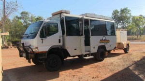 Früh am Morgen (6.55 Uhr) geht es los. Mit kleinem Gepäck und Schlafsack. Unser Guide „Sauce“ (wie Tomatosauce) holt uns im Allradbus am Hotel ab. Noch 2 weitere Stopps, dann ist die Gruppe vollzählig. 16 Leute zwischen 17 und um die 60 sitzen erst mal erwartungsvoll und relativ stumm im Wagen. Beim ersten Stopp im Roadhouse „Bark Hut“ gibt es eine Vorstellrunde. 8 Paare- Australier, Belgier, Chinesen, Franzosen – wir sind die einzigen Deutschen. Das zwingt uns 5 Tage lang nur Englisch zu sprechen. Es ist nicht immer einfach, den Guide zu verstehen, der sehr schnell spricht, aber beim Nachfragen wiederholt er geduldig alles Wichtige. Die Teilnehmer sind nett, kein unangenehmer dabei, der stört. Das fängt schon mal gut an. Gleich am ersten Tag gibt es Riesentermitenhügel zu sehn und 2 Badestationen „Rockhole“ und Florence Falls. Der Weg dorthin immer über Steine und durch Wald und Gebüsch. Heute am ersten Tag haben wir noch alle Warnungen im Kopf: Nicht über Stock und Stein laufen – Achtung Schlangen, Spinnen. In der Tat hören wir auch Rascheln am Wegesrand und einmal sehe ich etwas längliches verschwinden. Aber wenn das Schlangen sind, haben die mehr Angst vor uns als wir vor ihnen haben müssen. Trotzdem schauen wir immer genau wohin wir unsere Füße setzen. Und beim Baden in den Felsenpools trauen wir unserem Guide, dass dort keine Krokodile sind – zumindest keine Salzwasserkrokodile. Die sehen wir dann bei einer Bootstour auf dem Mary River am Nachmittag. Die erste Übernachtung auf einem richtigen Campingplatz in feststehenden Zelten mit Holzpritsche, aber mit Duschen (an den Wänden klettern Lizards hoch) und sogar einer Bar beim Bark Hut Roadhouse. Beim Essen machen und Wegräumen müssen alle mithelfen. Danach können wir den Tag in der Bar ausklingen lassen – aber nicht lange, morgen geht es um 7 Uhr los.