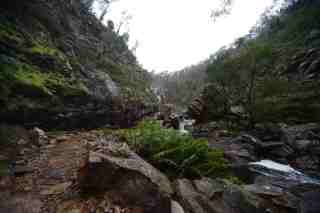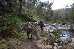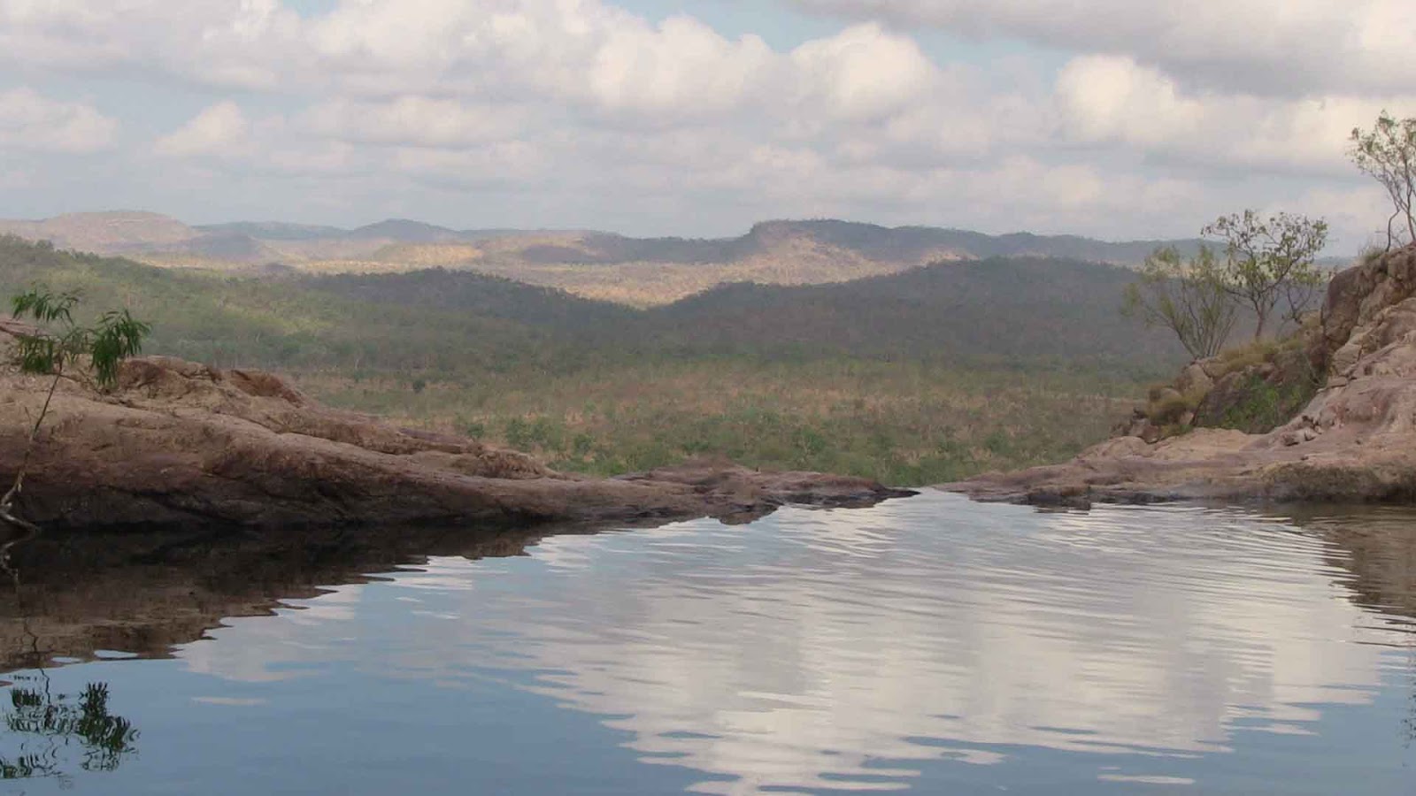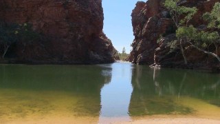 Es geht ganz schön über Stock und Stein. Wenn ich vorher schon die Schlangen im Desert Park von Alice Springs gesehen hätte, wäre ich nicht so arglos durch die Gegend gelaufen. Die tarnen sich nämlich so, dass man sie zwischen den Steinen und Ästen gar nicht sieht. Zum Baden ist mir das Wasserloch dann doch etwas kalt und tief. Schade, nach dem anstrengenden Marsch tut es auch gut, die Füße reinzuhängen (nein, Krokodile gibt es hier wirklich nicht!).