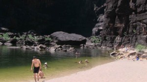 There are crocodiles here! In the morning we could choose between a boat ride, swimming, running, kayaking or a helicopter flight – depending on how much we wanted to see (and pay – helicopter: 170 dollars, boat 60 dollars). On a walk to the top at the lookout we saw a crocodile swimming through the river just as two of our group were paddling and other people were swimming: a freshwater crocodile – harmless (they say). I’m still glad that I decided to a take the boat trip. After having lunch outdoors and eating all the leftovers – lettuce, chicken, tuna and bread – we returned to Darwin. We all dreamt of showers, clean towels and clean clothes. We had to take a brush to get the dust off our legs. In the evening we (most of the group) met again in the bar of Monsoon’s in Darwin to talk about the beautiful days and to say thank you to our friendly guide. We exchanged e-mail addresses and remembered the great experience which lay behind us. Most of the tour had been spent climbing rocks and swimming in rock pools. Some of the routes took us to the limits of what we could do, but in retrospect, it’s a nice feeling to be able to say: you did it! We highly recommend this trip with Adventure Tours – but only for people in good health who that have no problems with their feet, knees and hips. Good anti slip shoes are a must, as is a large supply of insect repellent („Bushman’s 80%” – even in the dry season!) and sunscreen with a high protection factor. Definitely useful: a headlamp.