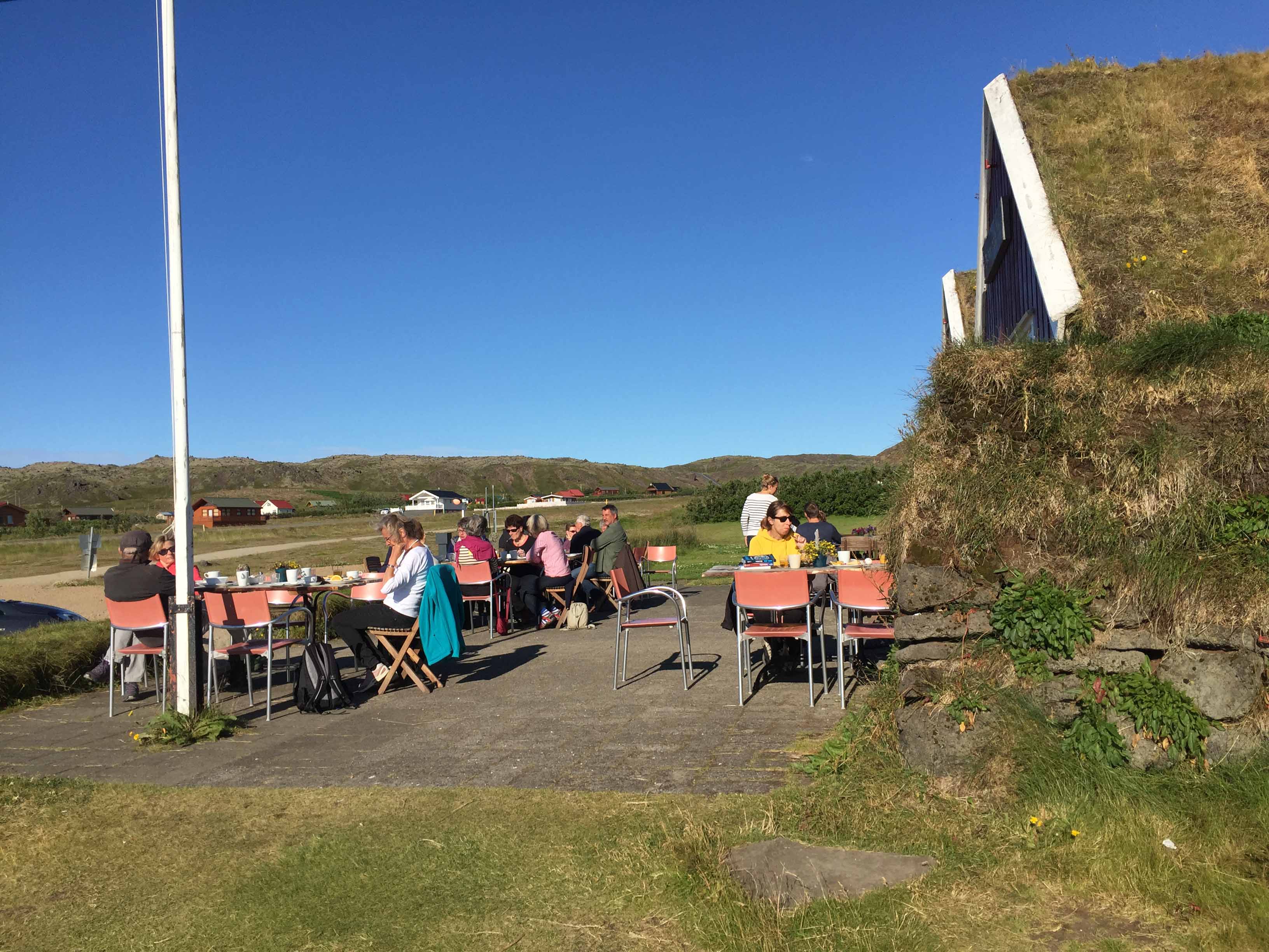 Der Blick auf den Skaftafell Gletscher, wie er so in der Sonne glänzt, ist spektakulär. Etwas weiter kommt man zu einem alten Hof „Sel“, der heute nur noch als Museumshof die alte Bauweise der Grassodenhäuser demonstriert. Noch höher gelangen wir zum Aussichtspunkt Sjónarsker, von dem man unendlich in die Weite über die Sanderflächen und Gletscherzunge des Skaftafellgletschers schauen kann. Das Picknick in der Sonne hier oben genießen wir sehr. Nach einem kleinen Abstieg gelangt man an den Svartifoss, einem Wasserfall, der über Basaltsäulen nach unten fällt. Am Fuß des Berges kommen wir am Camp der Wikingerreisen aus, wo man gerade auf eine neue Reisegruppe wartet, die die Campingtour gebucht haben. Mit einem kurzen Kaffeestopp im Sonnenschein auf der Wiese können sich unsere Füße etwas erholen. So schön ist es, barfuß über den Rasen zu laufen! Der Bus bringt uns mit einem Abstecher zu einer Grassodenkirche, die nochmal malerisch in der Sonne liegt, zurück zum Gästehaus. Was war das für ein Traumtag! Nur meine Arme sind ganz rot – also ab morgen ganz eincremen, auch wenn Regen angesagt ist! Das Abendessen mit Lachsforelle ist noch ein schöner Abschluss bevor wir todmüde ins Bett fallen.