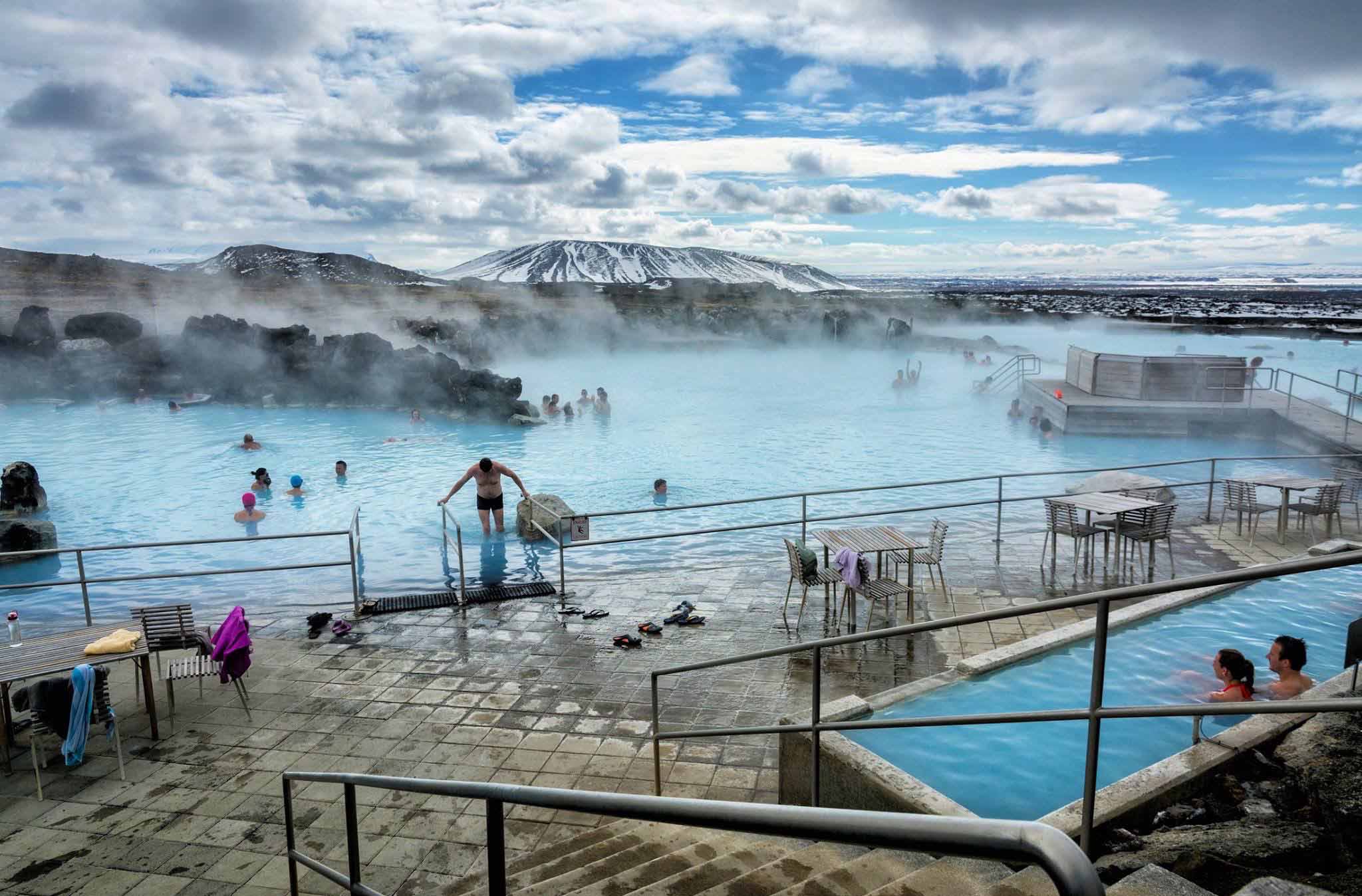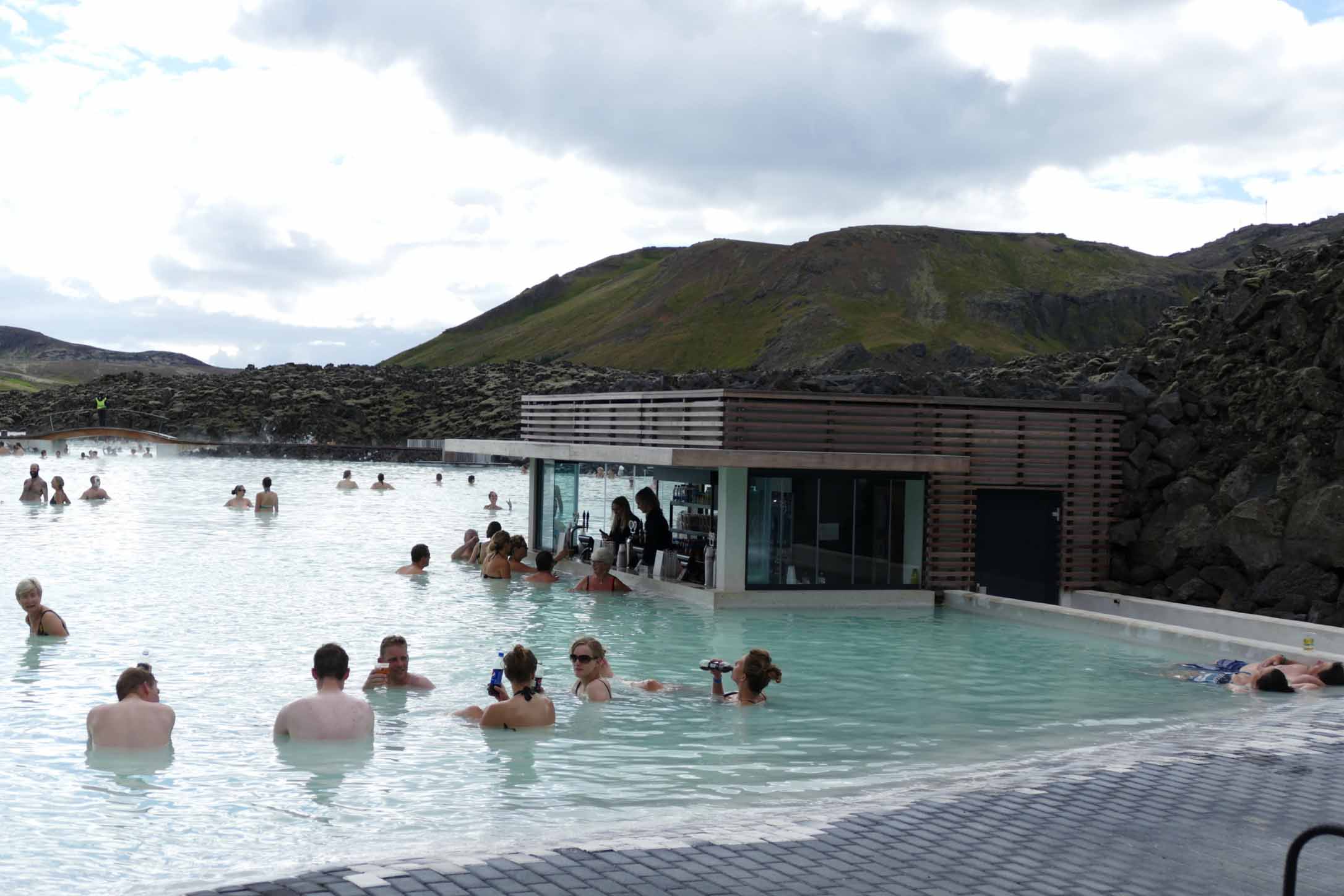 Weiter geht es zu einem aktiven Thermalgebiet mit der beeindruckenden Grjotagja – einer Grotte, in der ein heißer See den ganzen Raum aufwärmt wie eine Heizung. Das dampfende Wasser ist von einem unglaublichen blau! Auch in der Umgebung kommt aus vielen Erdspalten heißer Dampf. Es stammt aus dem Vulkansystem Krafla und wir registrieren ehrfürchtig, dass die Natur hier ihre ganze Gewalt zeigt. Immer noch brechen ab und zu die Vulkane Islands aus und die Erdkruste ist hier beängstigend dünn. Wir fahren zum Kraterrand Hverfall, den wir besteigen. Während des sehr steilen Aufstiegs durch die Lavalandschaften des Dimmuborgir kommt immer mehr die Sonne raus und wir kommen gehörig ins Schwitzen. Wieder einmal ein Beweis, dass man in Island jederzeit für jedes Wetter gewappnet sein muss. Zwiebellook ist das Zaubermittel! Von oben hat man einen atemberaubenden Ausblick auf die Vulkanlandschaft. Nach innen schauend schaut man in den Krater, mit einem Mini (-pseudo) Krater. Pseudokrater gleichen Vulkankratern, sind aber nicht durch einen Ausbruch entstanden, sondern durch eine Dampfexplosion, wenn die heiße Lage über wasserreiches Gelände fließt. Nach außen blickend sieht man eine weite Seenlandschaft mit vielfältigen Vulkanformationen. Der Abstieg ist sehr steil. Ich gehe seitwärts mit Stöcken, wie beim Skilaufen. Das klappt ganz gut. Der weiter Weg führt uns noch einmal 90 Minuten durch die von oben bewunderten Lavaformationen. Sehr eindrucksvoll und wieder einmal wünsche ich mir mehr Zeit! Erschöpft, aber gut gelaunt setzen wir uns am Ziel im Visitor Center mit einem Kaffee in die Sonne. Jonas, unser Busfahrer wartet schon auf dem Parkplatz. Jetzt kommt der entspannte Teil des Tagestrips. Wir besuchen das Myvatn Naturbath, was bei dem inzwischen sonnigen Wetter besonders Spaß macht. Das heißt, 9 von uns wollen das Relaxprogramm, die anderen machen noch schnell 2 Stunden eine Wanderung durch ein anderes Thermalgebiet. Wir genießen das warme Wasser! Es riecht zwar etwas nach Schwefel und ist mit 4000 Kronen (etwa 35 Euro) auch nicht billig, aber nach der Wanderung jeden Cent wert! Hier sind auch viele einheimische Besucher, wahrscheinlich weil es Samstag ist. Schade, dass der Bus uns nach 2 Stunden wieder abholt. Auf der Rückfahrt fängt es wieder an zu regnen, aber jetzt stört uns das nicht mehr nach diesem tollen Tag. Nach dem wieder Mal hervorragenden Abendessen müssen wir leider wieder packen. Morgen geht es weiter zu unserem letzten Ziel: Anarstapi auf der Halbinsel Snaefelsness, wo wir die letzten 3 Tage verbringen werden.