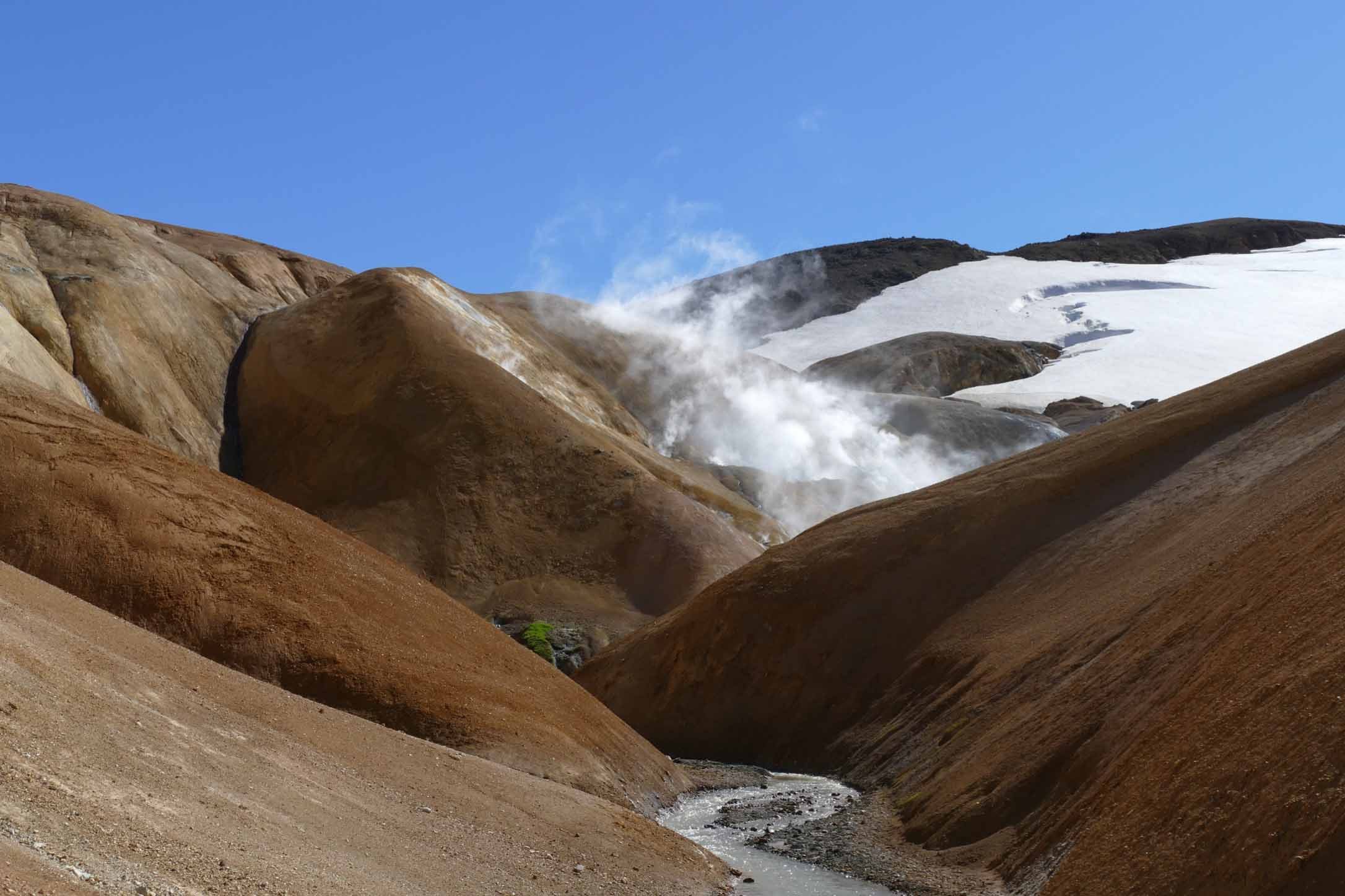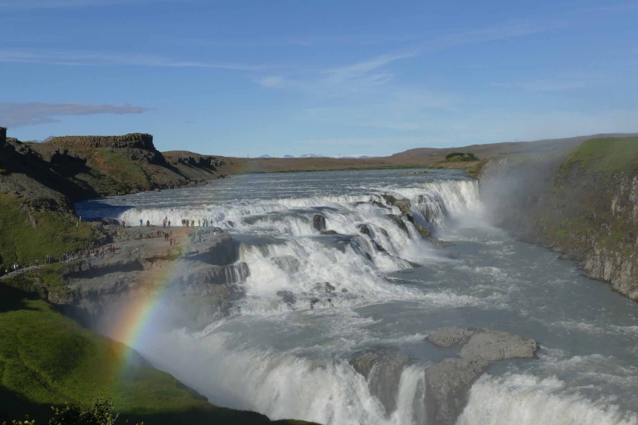 Wir fahren weiter und kommen an einen grün schimmernden Gletschersee, um den wir herum fahren. Kurz danach geht es rechts ab in die Berge zum Thermalgebiet Kerlingarfjöll. Wir stellen das Auto ab und wandern durch das Gebiet, in dem überall heiße Fumarolen aufsteigen, heiße Quellen blubbern und dampfen und die abgelagerten Mineralien die Landschaft bunt gestalten. hier kann man stundenlang wandern, ständig bergauf und bergab, manchmal sehr steil und anstrengend, aber da wir in unserem eigenen Tempo gehen, bleibt Zeit genug, die Schönheit der Gegend zu genießen. Hier ist der höchste Punkt des Gebirges Kjalvegur und die Wasserscheide. Höher als etwa 800 m geht es ab hier nicht. Man könnte jetzt über den Kamm zu einem Campingplatz mit Restaurant laufen, aber dann müsste wir zurück, um unser Auto zu holen. Daher kehren wir um und fahren um den Berg herum auf einer sehr engen Straße dort hin. Man kann dort an Picknicktischen in der Sonne sitzen. Wir genießen das unglaubliche Licht heute nachmittag und essen unser Sandwich. Wieder mal ein Paradies für Fotografen. Wir können uns kaum losreißen, aber es ist schon 16 Uhr und wir müssen die 200 km wieder zurück fahren. Aber der Rückweg geht schneller. Wir halten nur noch einmal am Gullfoss, der jetzt noch fotogener die schönsten Regenbogen in der Abendsonne malt. Auf die Idee sind auch noch viele andere gekommen, aber Busse sehen wir keine mehr. Wir nehmen jetzt den Rückweg über Selfoss und die Ringstraße. In Hvergerdi kurz vor Reykjavik halten wir an, um im Kjöt og Kúnst (Fleisch und Kunst), einem stylischen gemütlichen Restaurant zu Abend zu essen. Man backt hier in dem Thermalgebiet, das wir an einem anderen Tag noch erkunden wollen, in Erdöfen. Ich liebe das Brot und auch das Essen ist hervorragend. Zurück im Hotel können wir uns nicht aufraffen, nochmal in die Stadt zu gehen. Es ist Samstag ist und viel los, zudem noch taghell, jetzt um 22 Uhr, aber wir sind einfach zu müde. Es war ein toller Tag. Wir waren 14 Stunden unterwegs, sind 480 km gefahren und viel gewandert. Wir nehmen uns ein Getränk mit aufs Zimmer und schlafen fast ein, bevor es ausgetrunken ist.