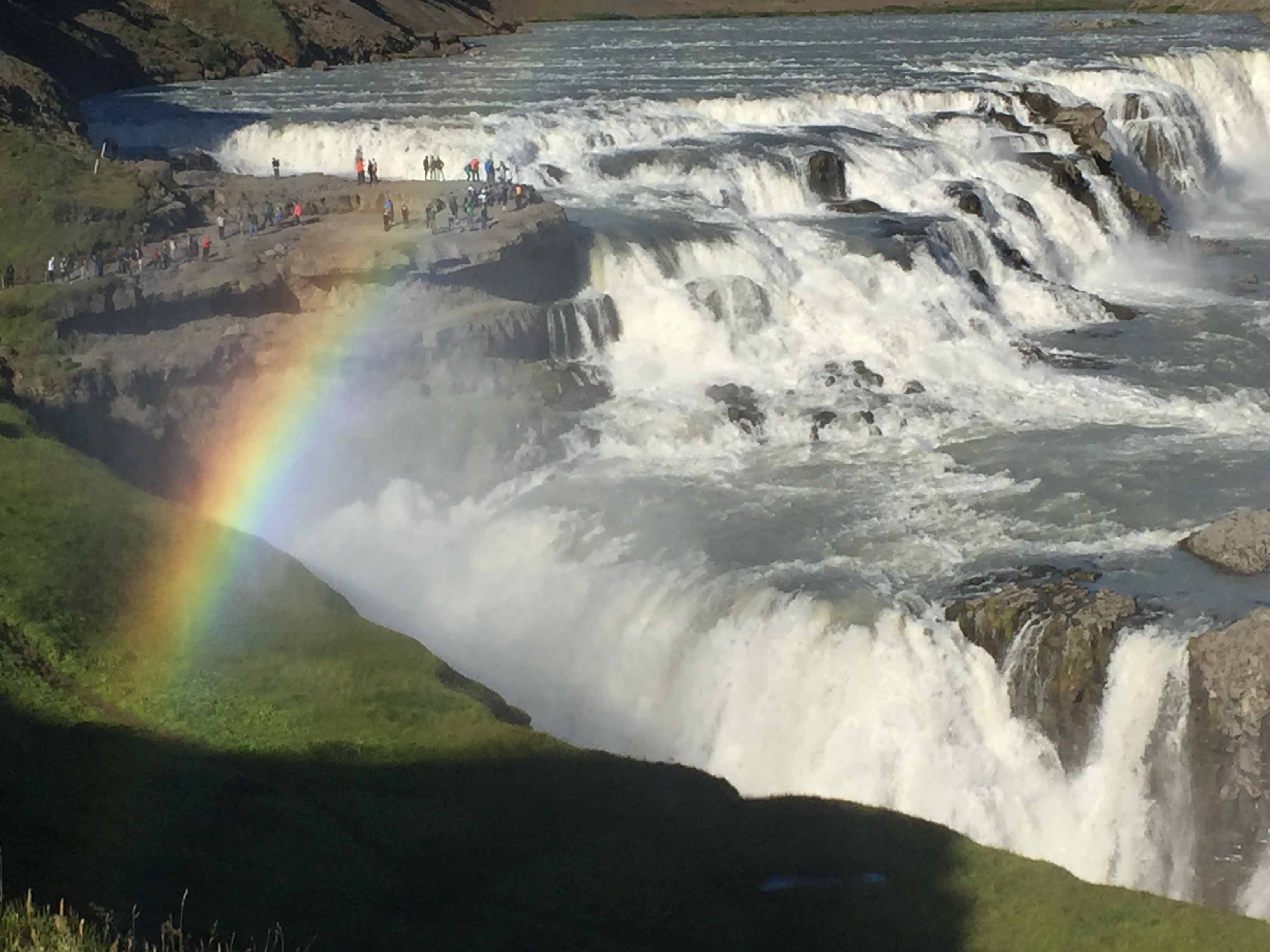 Das erste Etappenziel ist das Freiluftmuseum Skógasafn. Eine sehr nette Österreicherin führt uns auf deutsch durch die Ausstellung, wo man eine Menge über die Lebensweise der Vergangenheit erfahren kann. Sie erzählt sehr unterhaltsam und vor allem die Schilderung der Imprägnierung der Fischerkleidung mit Fischöl löst einiges Grausen bei uns aus. Danach besichtigen wir die Häuser mit ihren Torfdächern von außen und innen. Leider finden wir auch hier wieder die Zeit zu kurz um alles in Ruhe zu erkunden, denn schon wartet der Bus, um uns zum Skogafoss zu bringen. Dieser Wasserfall stürzt über eine Kante nach unten und man kann über eine steile Treppe bis an die oberste Stelle gehen (gefühlte 5000 Stufen…). Aber es lohnt sich. Immer wieder strahlen von der Sonne beschienene Regenbogen fotogen in der Gischt des Wasserfalls. Wieder haben wir nur ein paar Minuten, um dieses Schauspiel zu genießen.