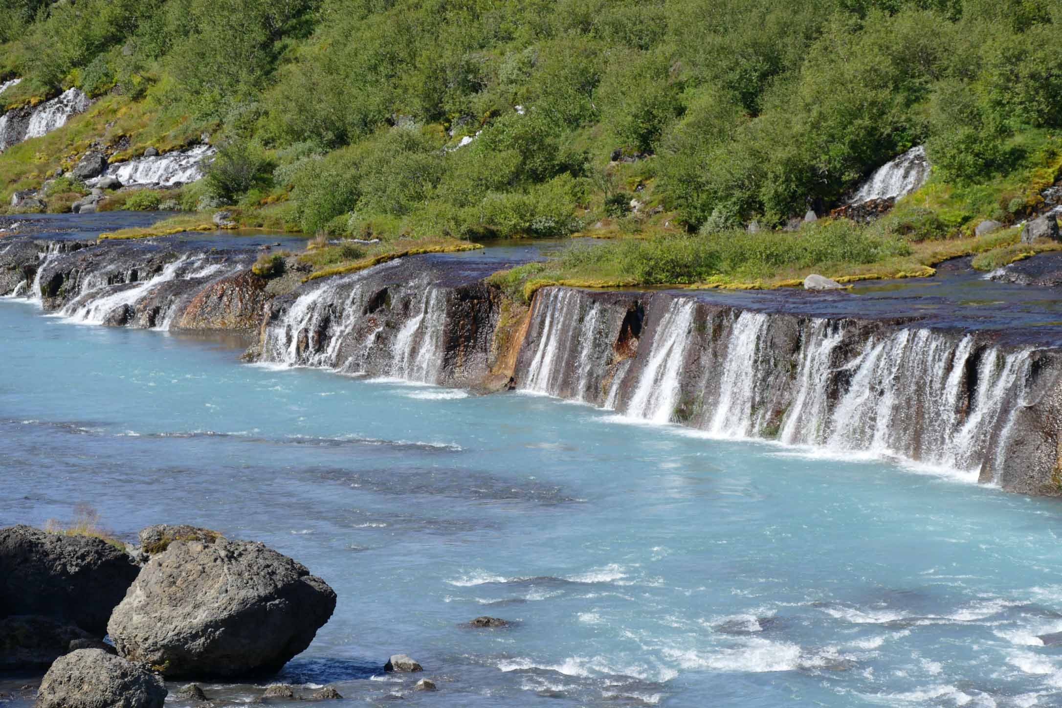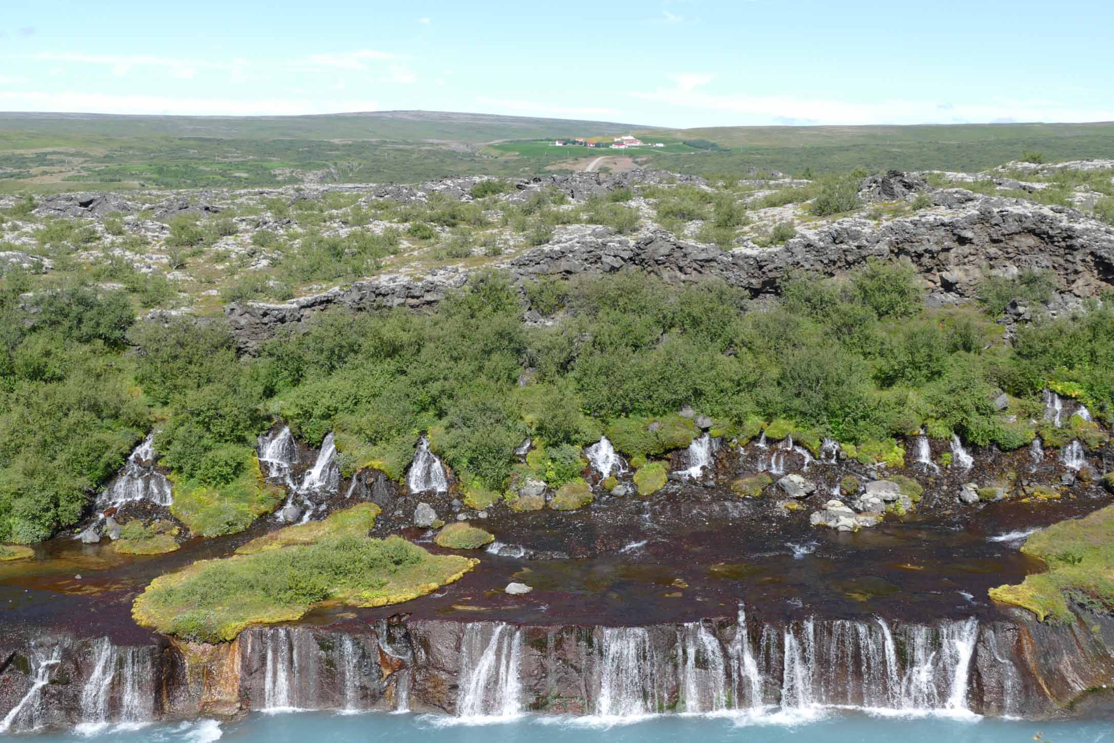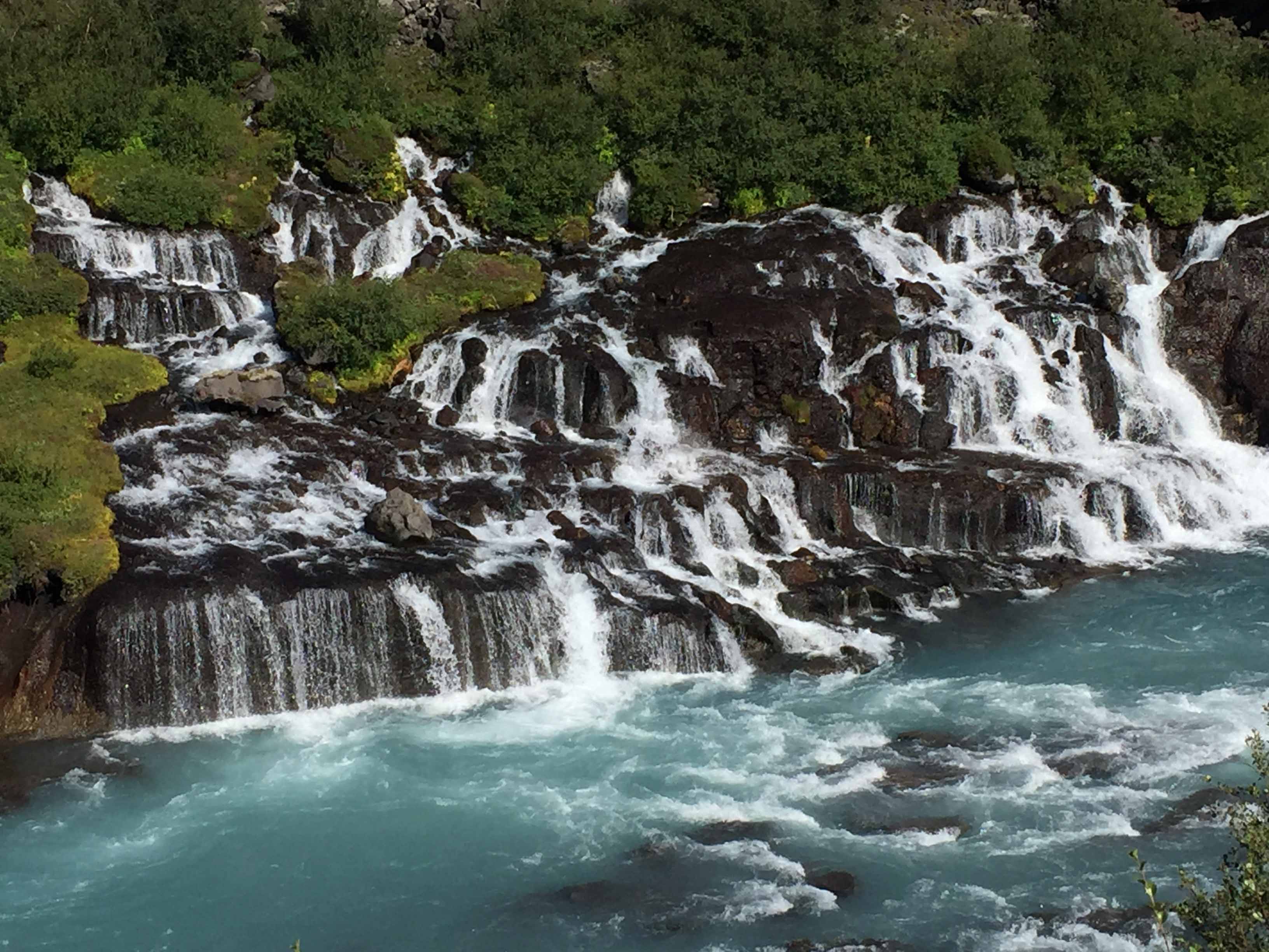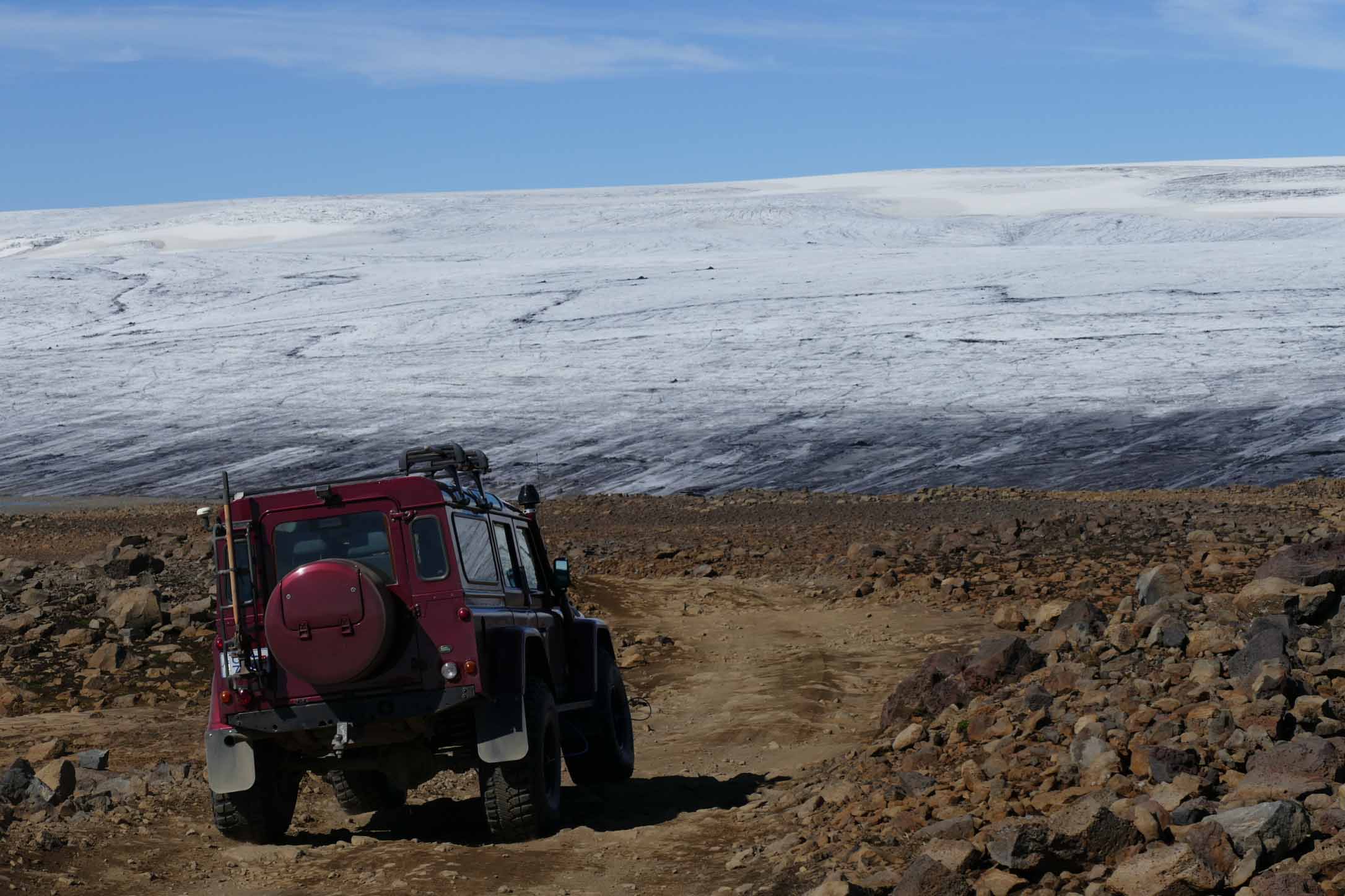 Weiter geht es über Reykholt nach Hraunfossar, einem 700 m breiten Wasserfall, der nicht über eine Kante fällt, sondern aus der Lava (Isl. hraun) des Hangs heraus in einen wild sprudelnden Fluss fließt. Ein unglaublicher Anblick. Man kann auf dem Weg gegenüber dem Wasserfall entlanglaufen, wo sich viele schöne Fotomotive ergeben. Unser Reiseführer empfiehlt eine Mittagspause in Husafell. Dort ist aber der Teufel los. Das Lokal quillt über und dafür stehen etliche Busse. Wir begnügen uns mit einem Eis und fahren weiter zur Kaldadalsvegur (Straße F 550), einer Schotterpiste, die auch wieder nur mit Allradautos befahren werden darf und die durch das wilde Hochland führt. Die 40 km lange Piste führt bis auf über 700m Höhe am Gletscherrand des Langjökull vorbei (auf der anderen Seite als gestern) und am Pórisjökull. Eine spektakuläre Landschaft! Schwarze Lava, weißes, glitzerndes Eis und blauer Himmel. Schön! Und staubig! Die entgegenkommenden Autos wirbeln den Staub auf und er dringt in jede Ritze. Die Fahrt dauert lange, weil man erstens nicht schnell fahren kann und wir zweitens sehr oft anhalten, um Fotos zu machen und die Landschaft ohne Staubwolken zu genießen.
