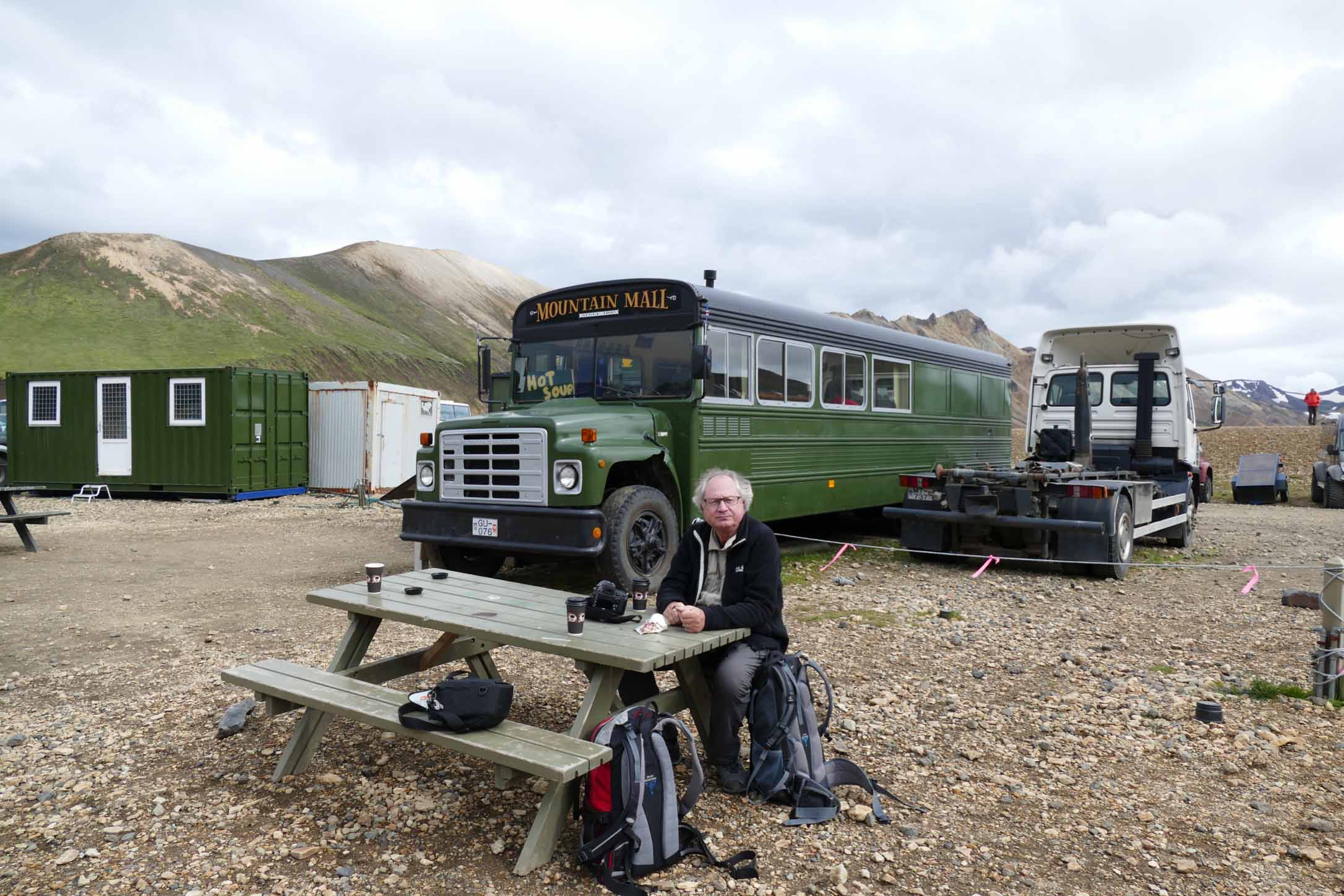 Wir wollen erst einmal eine Wanderung hinter dem Camp auf den nächsten Berg machen. Der Himmel klart wieder auf und wir machen uns auf den Weg. Es ist sehr steil und an einer Stelle muss man sich an einem Seil hochziehen. Aber alles ist gut markiert und es ist phantastisch durch diese tolle farbenreiche Kulisse zu wandern. Oben angekommen hat man einen phantastischen Rundblick. Man könnte auch hier Stunden und Tage weiter wandern, aber wir müssen zurück zu unserem Auto. Baden können wir heute nicht, wir haben nichts dabei und so begnüge ich mich damit, die Füße ins (sehr heiße!) Wasser zu halten. Der Naturpool ist auch sehr voll. An einem anderen Tümpel auf der Weide stehen Schafe im warmen Wasser und fressen das Gras am Ufer. Wir trinken noch einen Kaffee in der „Mountain Mall“, einem alten Bus, der zum Cafe und Kiosk umfunktioniert ist.