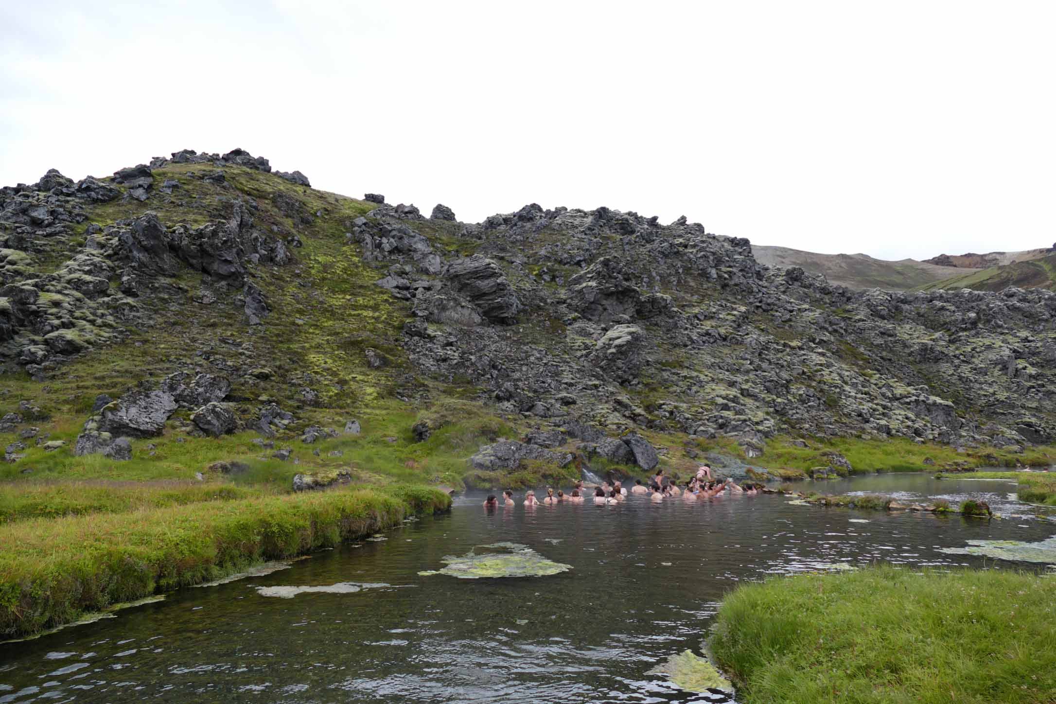 Landmannalaugar ist ein Gebiet in der Nähe des Vulkans Hekla mit warmen Quellen, Hochweiden und Thermalgebieten. Es gibt auch eine Stelle, an der man im warmen Wasser baden kann.