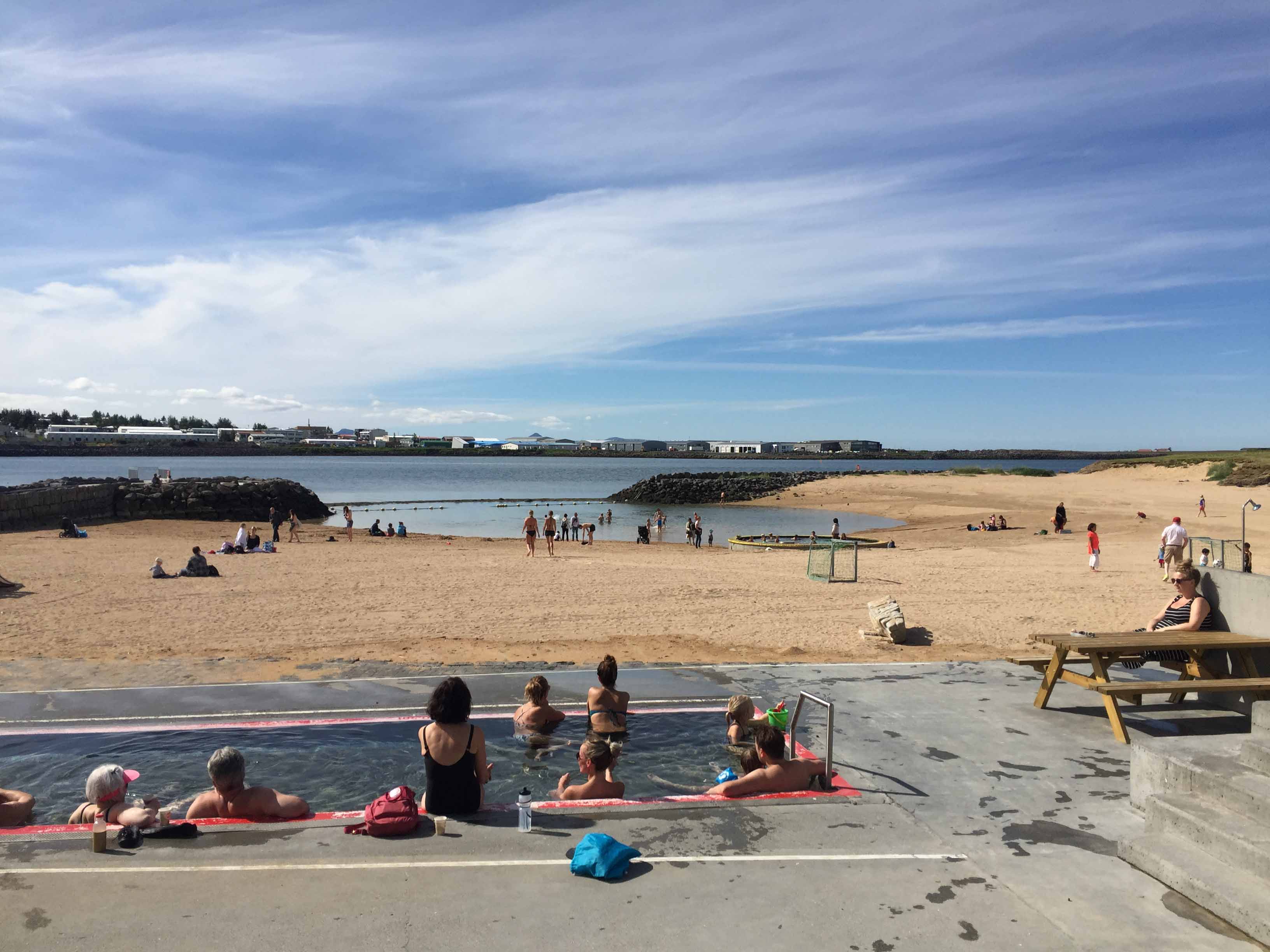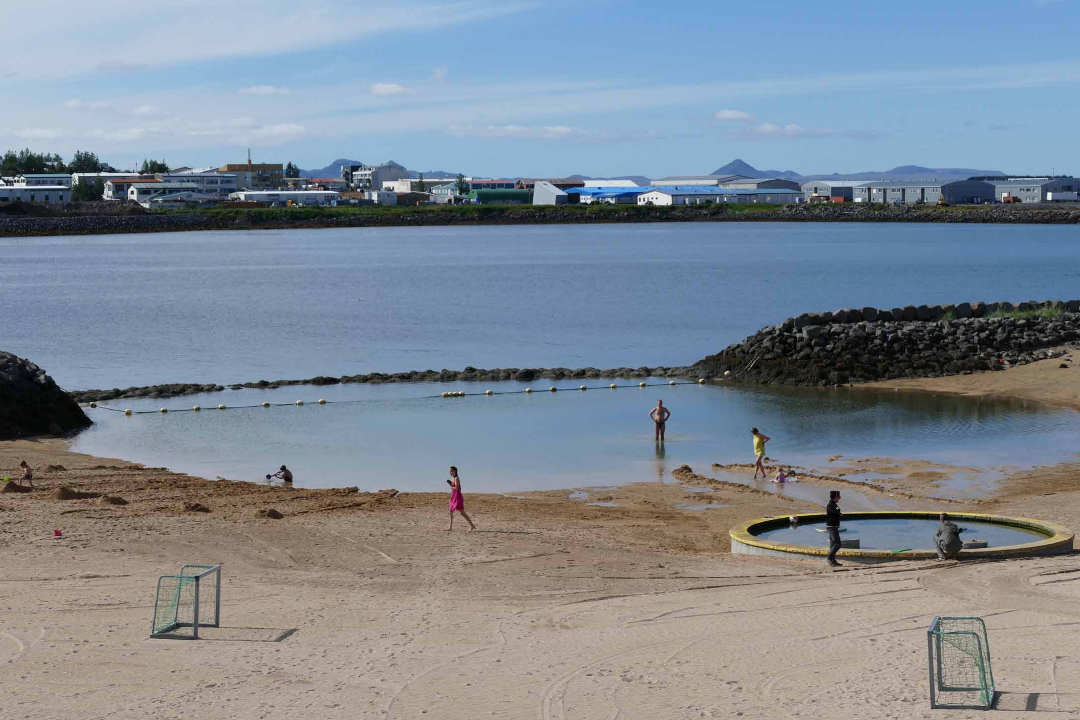 Mit dem Bus 18, der vor unserer Türe hält, fahren wir danach nochmal zum Perlan. Wir haben unser Badezeug mit, da es dort ein Thermalbad (Nauthólsvik) am Fjord geben soll. Zu Fuss war der Weg trotz Karte nicht so einfach zu finden, aber wir sind begeistert, als wir dort ankommen. Sand unter den Füßen, ein Thermalpool und in die Bucht wird ebenfalls warmes Wasser geleitet, so dass man dort schwimmen könnte. Peter nimmt die Gelegenheit direkt wahr. Mir ist das immer noch zu kalt. Statt 8 jetzt 14 Grad ist auch keine Wohlfühltemperatur für mich. Es gibt Bänke, Tische, Umkleiden, warme Duschen und Toiletten und das Ganze kostet nicht mal Eintritt. An einem Kiosk kann man Getränke und kleine Snacks kaufen. Wirklich ein Geheimtipp. Ich würde das immer der berühmten (und sehr teuren) touristischen blauen Lagune vorziehen. Das Becken ist rechteckig und nicht sehr groß, reicht aber für die Leute, die dort sind (nur Isländer) vollkommen aus. Wir genießen, Sonne und warmes Wasser und sitzen noch lange im Sand und schauen den spielenden Kindern zu.