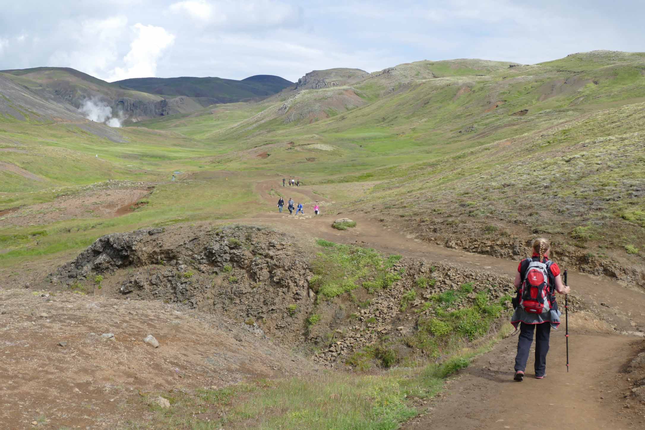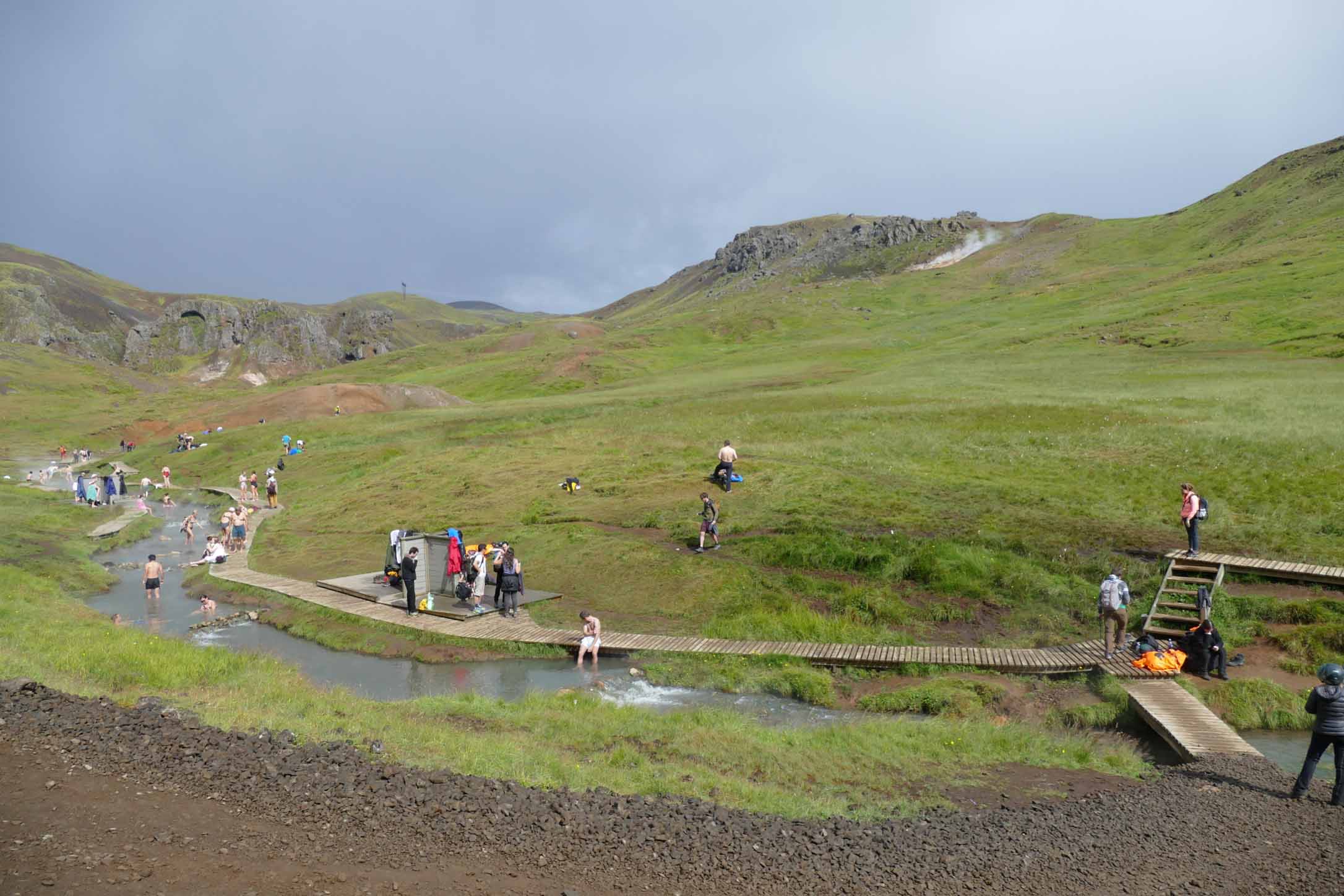 Wir fahren durch den Ort Hvergerdi bis man an eine Schotterstraße kommt und das Tal Reykjaladur beginnt. Hier findet man auch das Dalakaffi, ein kleines gemütliches Cafe. Hinter dem Parkplatz geht ein Wanderweg hoch zu den Thermalquellen, 4 km lang, stellenweise recht steil und dann in ein Hochtal hinein. Der Blick schweift hier weit über die umliegenden Berge. In der Ferne rauscht ein Wasserfall und schon von Weitem sieht man den Dampf der heißen Quellen aufsteigen. Die Sonne scheint warm, aber plötzlich ruft Peter: „Halte mich nicht für verrückt, aber hier fallen Hagelkörner!“ In Minuten wird aus dem leicht bewölkten Himmel ein dunkles Inferno. Zum Glück sind wir gut mit Regensachen ausgestattet. An gurgelnden heißen Quellen vorbei gelangen wir an einen kleinen Bach. Durch das heiße Wasser gespeist kann man hier in erträglich warmen Temperaturen baden. Es sind viele Leute im Wasser – trotz den immer stärker werdenden Regens – naja, nass sind sie ja eh schon. Aber wir wollen und jetzt nicht ausziehen, weil es hier nur ein paar Bänke und Ecken zum Umkleiden gibt und nichts, wo man die Sachen trocken lagern kann. So wate ich nur wieder mit den Füßen im Wasser. Auch von hier aus führen viele Wanderwege weiter in verschiedene Richtungen. So schnell, wie der Regen gekommen ist, so schnell hört er auch wieder auf und die Sonne ist wieder da. Aber am Ufer ist es immer noch zu nass und es ist auch schon spät geworden. Wir müssen die 4 km auch wieder zurück. Beim Abstieg trocknen unsere pitschnassen Sachen schnell wieder. Ich packe meine Kamera aus und mache noch Fotos und Filmaufnahmen von den brodelnden Löchern, die an riesige Kochtöpfe mit kochendem Wasser erinnern. Am frühen Nachmittag sind wir wieder unten und genehmigen uns diesmal Kaffee und Kuchen im Kjöt og Kúnst. Den hatten wir beim Abendessen schon bewundert, aber als Nachtisch für zu mächtig befunden. Aber jetzt ist es genau das Richtige.