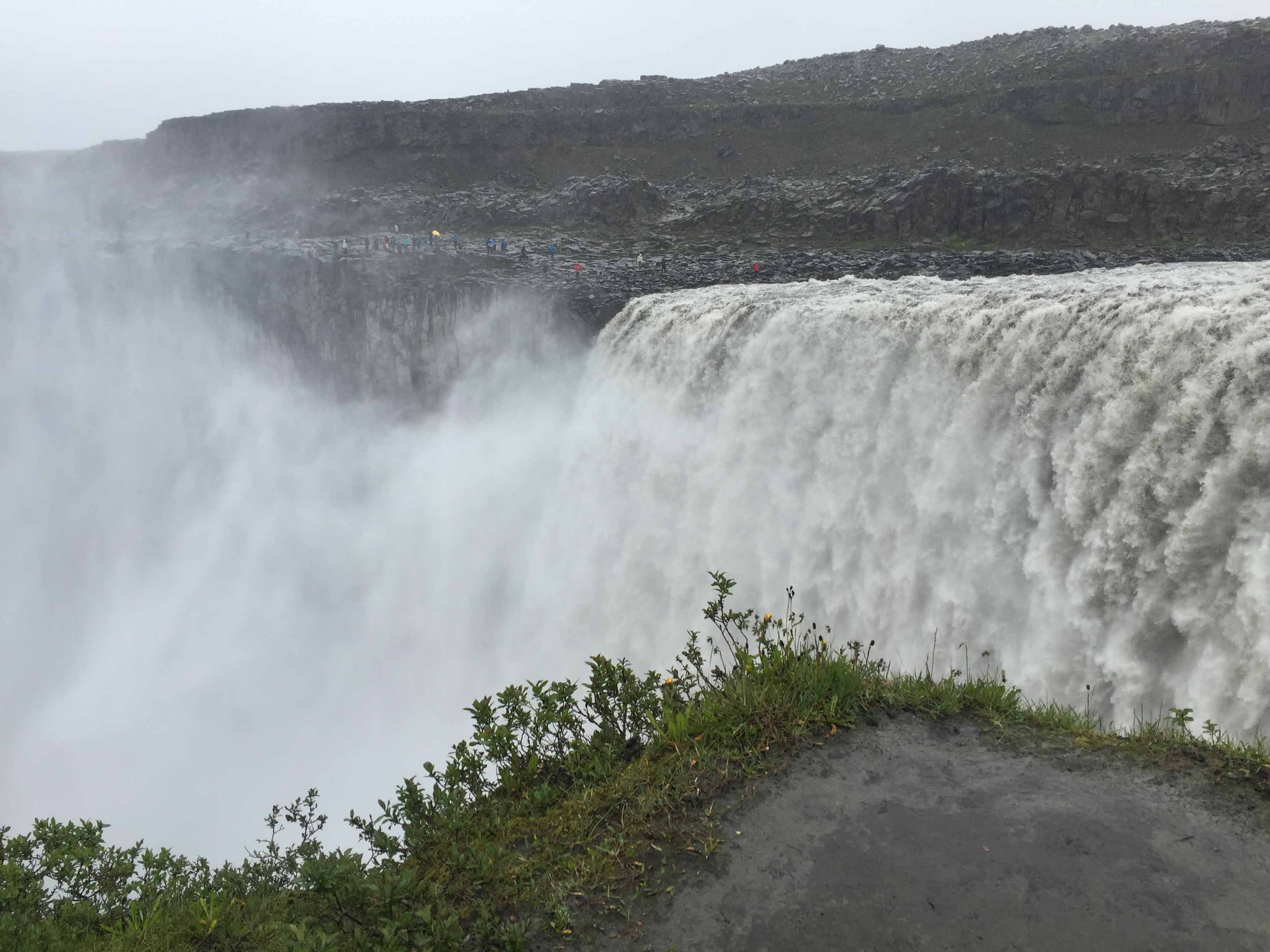 Der zweite Stopp ist an den Wasserfällen Dettifoss und Selfoss, wo wir etwa 1 1/2 Stunden laufen. Schade, dass an diesen spektakulären Orten das Wetter so schlecht ist, dass man kaum etwas sieht vor Regen und Wolken und sich die beiden nicht sehr fotogen präsentieren. Am Dettifoss stürzen sich die Wassermassen des Flusses Jökulsá á Fjöllum mit unheimlicher Gewalt in die hufeisenförmige Schlucht Asbyrgi und die Gischt verhindert, dass man die Menschen auf der anderen Seite sehen kann. Man kann sich kaum lösen von diesem imposanten Anblick und merkt erst auf dem Rückweg, wie die Nässe und Kälte des Regens sich in jeden Winkel der Kleidung schleicht. Wir wandern noch ein Stück über steinige Wege am Flusslauf entlang, durch den Nationalpark Jökulsargljúfur, wo sich schöne Basaltformationen zeigen, eine der eindrucksvollsten ist Hljódaklettur, der Echofelsen. Eigentlich eine schöne Wanderung, die aber durch Kälte und Nässe getrübt wird.
