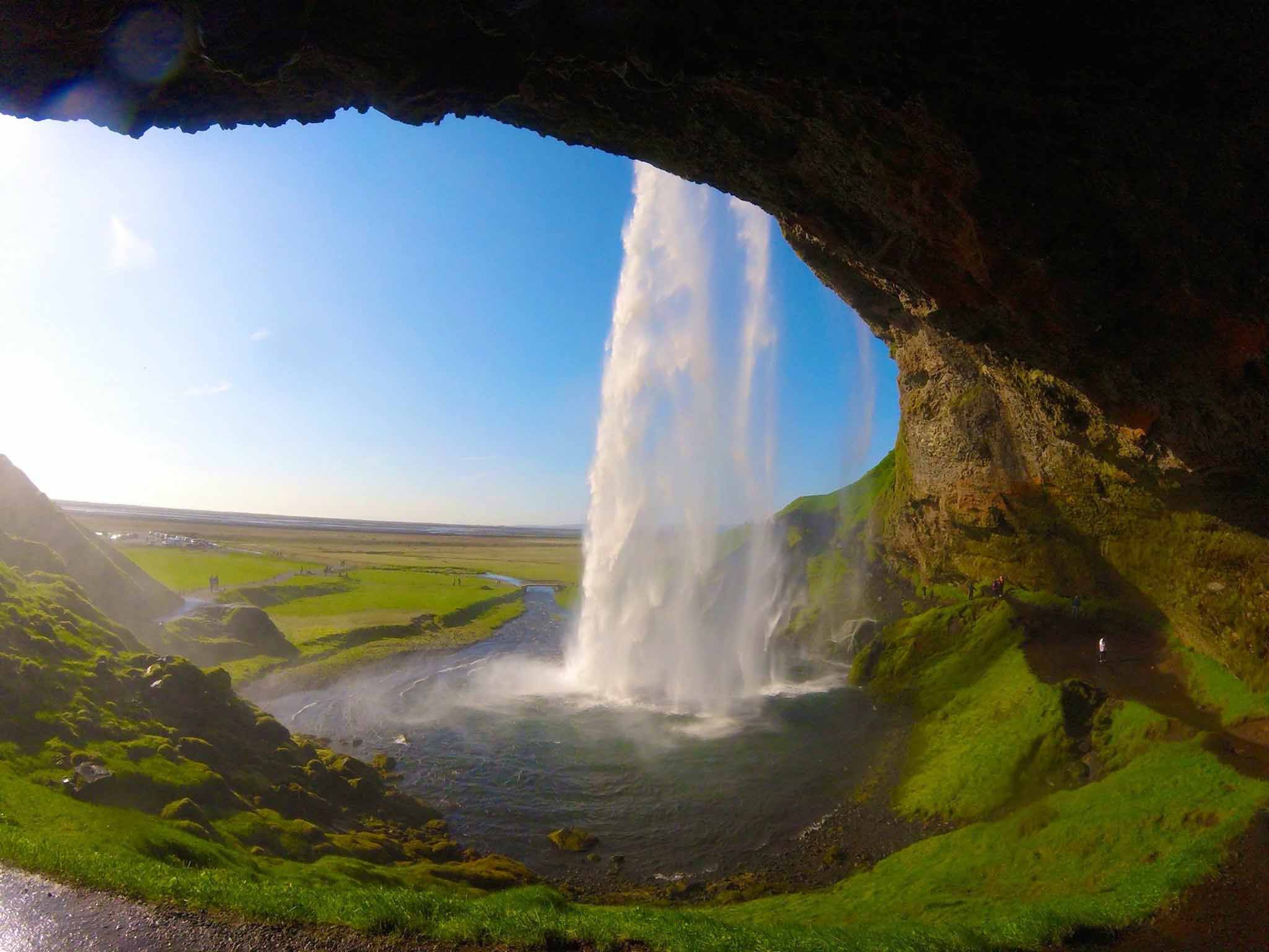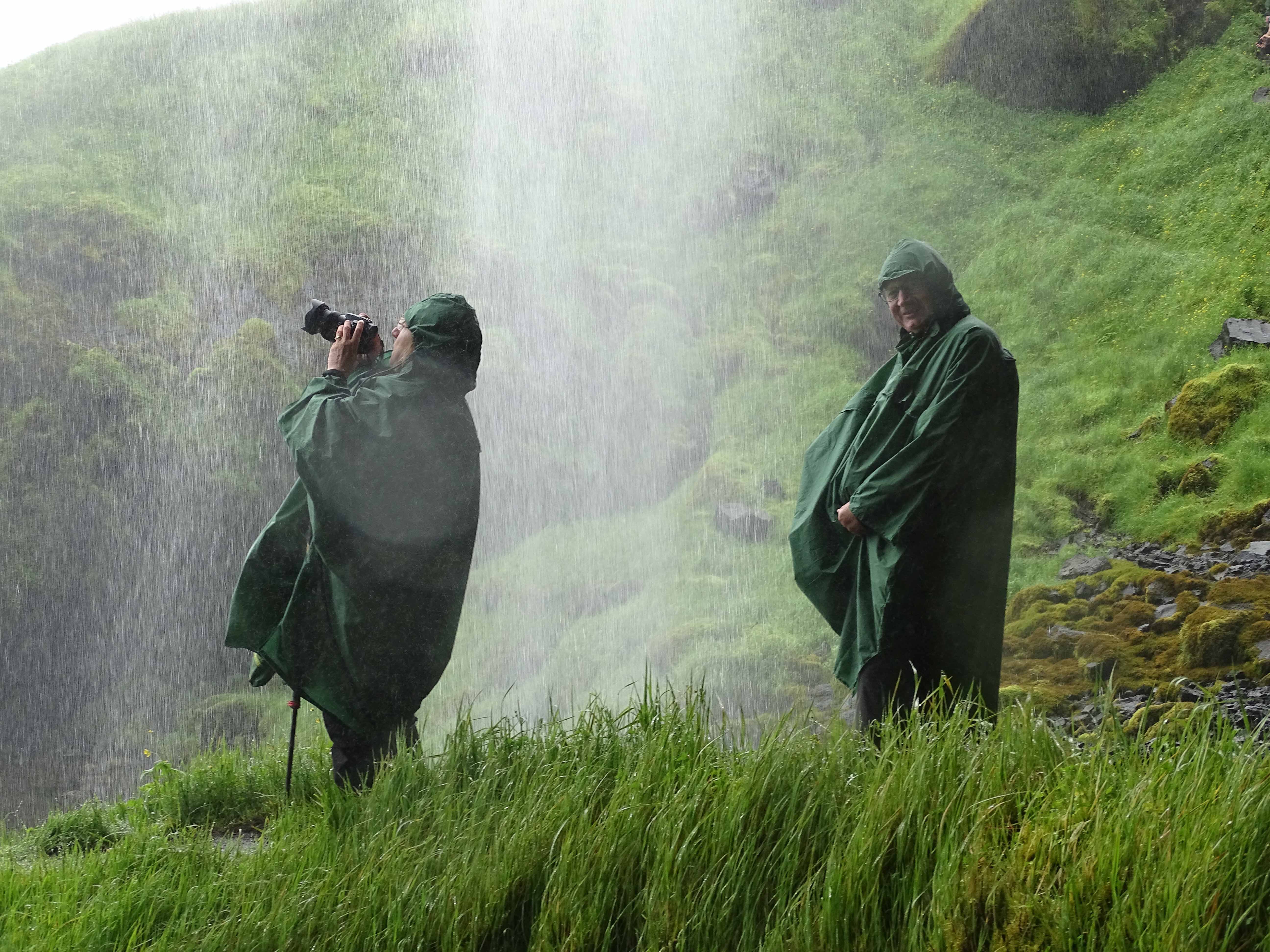 Zuerst fahren wir zum Seljalandsfoss. Hinter diesem Wasserfall kann man auf einem Weg entlanglaufen. Eine ganz neue Perspektive und ein schönes Fotomotiv. Eine gute Idee war es, unsere Regencapes anzuziehen – vor Allem um die Fotoausrüstung vor Spritzwasser zu schützen. Am Ende des Weges gelangt man noch zum Gljúfurárfoss, zu dessen Fuß man zwischen engen Felswänden durch einen Bach laufen muss. Spektakulär, wie er in der engen Schlucht hinunter stürzt.