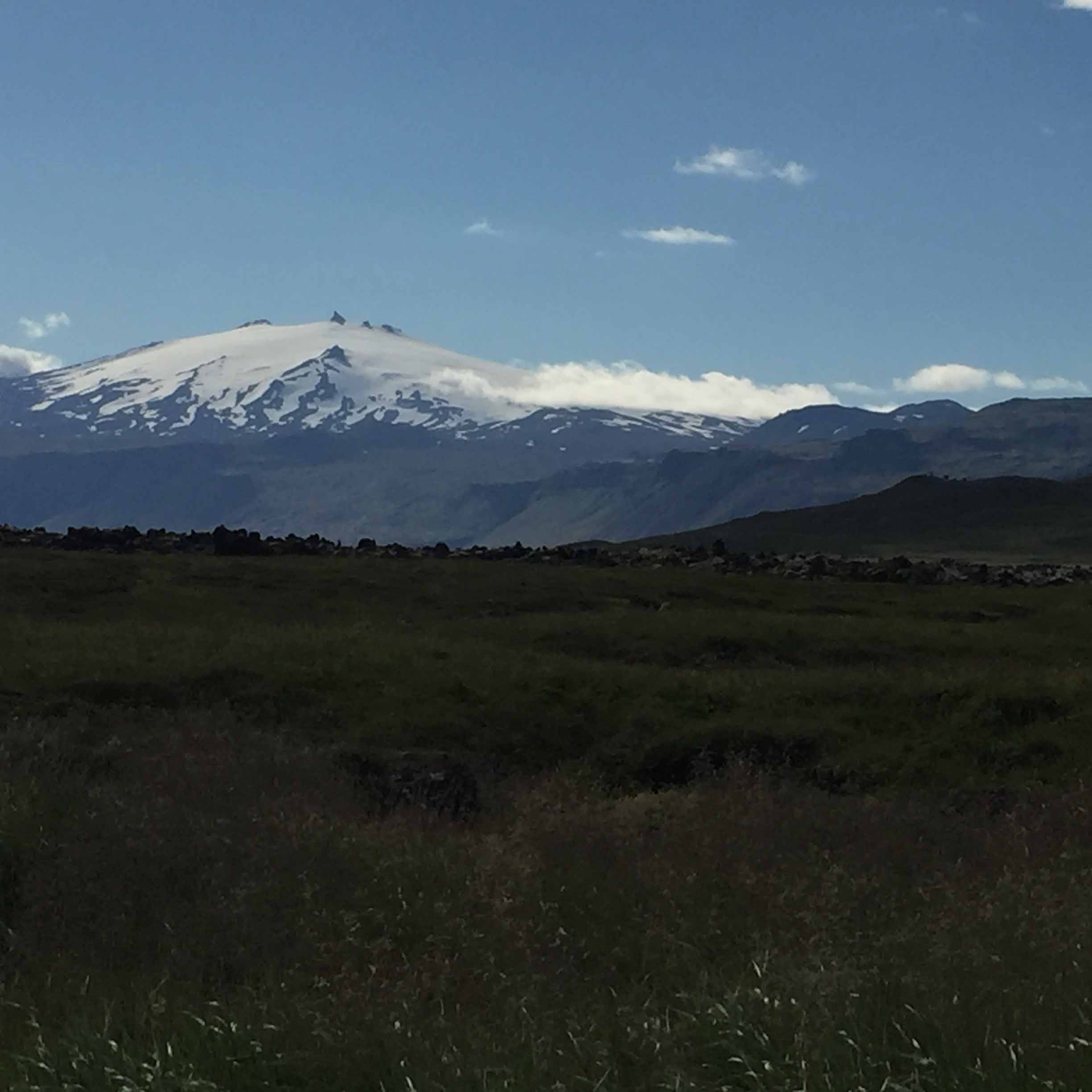Auf der Weiterfahrt wird es richtig kalt. Wir stoppen nochmal an einem Rasthaus, wo uns Christoph das nächste Ziel erklärt. Es gibt wohl sehr ungleiche Unterkünfte, von einfachen Zimmern ohne alles, über Zimmern mit Waschbecken und kleinen Hütten mit eigenem Bad. Er wird die Schlüssel nach den Zufallsprinzip verteilen. Am späten Nachmittag kommen wir am Gästehaus Snjofell in Anarstapi an. Snaefellsness ist eine Halbinsel im Westen von Island und man sagt, es ist ganz „Island im Kleinen“. Es gibt Gletscher, Vulkane und Wasserfälle und ich finde, es ist eine der schönsten Gegenden Islands. Bei der Zimmerverlosung haben wir einigermaßen Glück. Zwar keine Cottage mit Bad, aber ein großes Zimmer mit Waschbecken und eine Dusche für 4 Zimmer so wie ein Extra WC vor der Tür. Alles sehr sauber. Das lässt sich aushalten. Die Lage des Gästehauses ist traumhaft! Direkt an der Steilküste mit unzähligen Vogelfelsen. Achtung: wenn man durch die Wiesen geht, greifen sie auch schon mal an um ihre Nester zu verteidigen. Stock mitnehmen! Eine große Steinfigur von Bárdur, halb Troll halb Mensch steht unübersehbar am Anfang des Küstenweges und gilt oftmals als Schutzpatron der Gegend. Auf der anderen Seite blicken wir auf das Gletschermassiv des Snaefellsjökull, der momentan von der Sonne beschienen wird. Wir spazieren nach dem (guten) Essen noch lange auf dem Küstenweg entlang und genießen die Mittsommersonne, die auch jetzt noch bis nach 10 Uhr scheint.