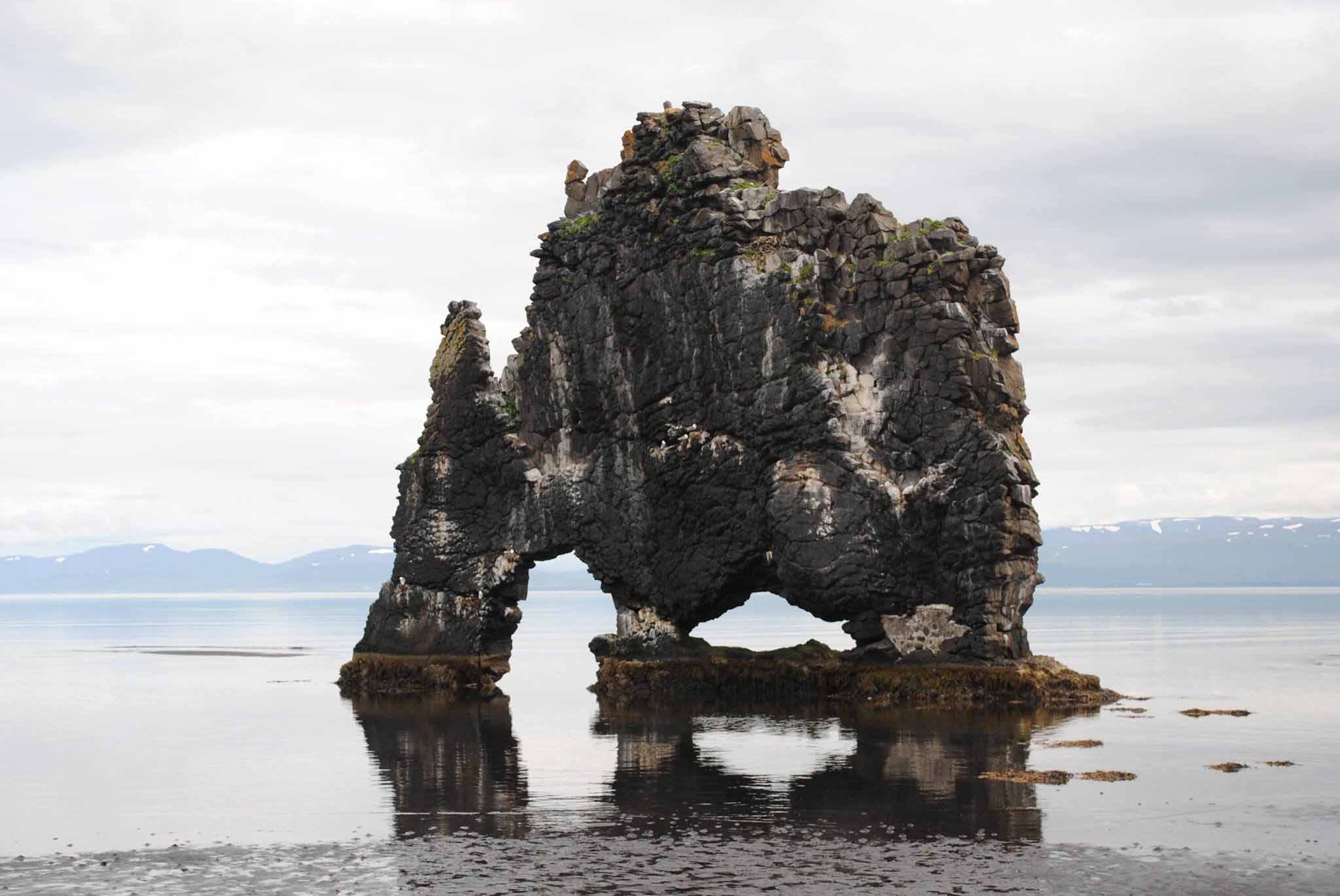 Heute ist Sonntag und auf dem Weg werden wir noch einige Sehenswürdigkeiten besichtigen, die hoffentlich nicht aufgrund des Wochenendes überlaufen sind. Um 8:30 Uhr geht es bei vielversprechendem Wetter los (Regenjacke und Pullover in greifbarer Nähe!). Zuerst halten wir am Freiluftmuseum Glaumbaer, einem ganzen Museumsdorf mit Grasdächern, ähnlich wie im Süden, aber viel größer. Hier könnte man eigentlich einen halben Tag verbringen, inclusive Kaffeetrinken in dem gemütlichen alten Café, das aussieht wie eine Puppenstube mit alten Möbeln und Sammeltassen, in denen Kaffee serviert wird und selbstgebackener Kuchen auf passenden Tellern. Sehnsüchtig schaue auf die entspannt in Sesseln sitzenden Touristen, auf die kein Bus wartet. Aber wir müssen weiter und ich kaue stattdessen an meinem Müsliriegel. Unterwegs halten wir noch an einem Supermarkt, um uns für die nächsten 3 Tage einzudecken, da es dort keine Möglichkeit gibt. Sonne und Wolken wechseln sich im Minutentakt ab. Unser nächstes Ziel ist die Halbinsel Vatnsnes mit ihrem berühmten Vogelfelsen. Wir fahren am Ufer der Halbinsel entlang und halten an 2 Stellen. Erstmal natürlich am markanten Basaltfelsen Hvitserkur im Meer, der auf keiner Islanddoku fehlen darf. Durch die Vogelexkremente erscheint er fast weiß. Der zweite Stopp ist eine Robbenkolonie an der Spitze der Insel. Man kann mit dem Fernglas viele Robben erkennen, die im Wasser spielen und sich auf den Felsen sonnen, aber sie sind schon sehr weit entfernt. Wir beobachten das Treiben eine ganze Zeit lang.