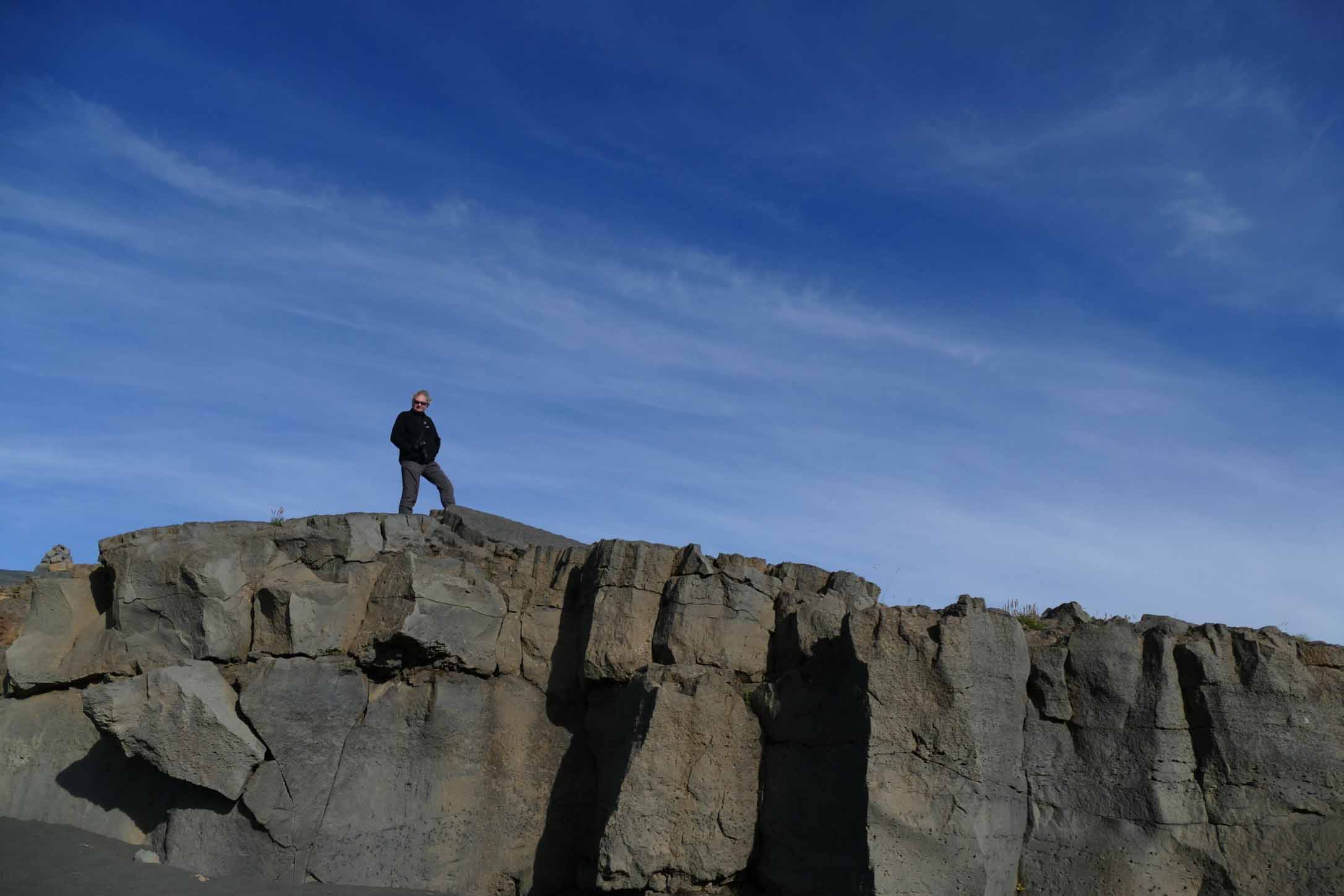Weiter geht es nach Vík í Myrdal, wo wir von einem Leuchtturm aus über die Klippen wandern, eine spektakuläre Aussicht auf das tosende Meer, den schwarzen Strand und die Felsformationen, denen man nachsagt, es seien versteinerte Trolle. Auch hier fehlt wieder mal die Zeit, um alles in Ruhe und mit dem geeigneten Wolkenloch zu fotografieren, denn schon wieder wartet der Bus, der uns zum schwarzen Sandstrand von Dyrhólaós mit seinem eindrucksvollen Felsentor bringt. Eine halbe Stunde bleibt uns, um über die Felsen zu klettern.