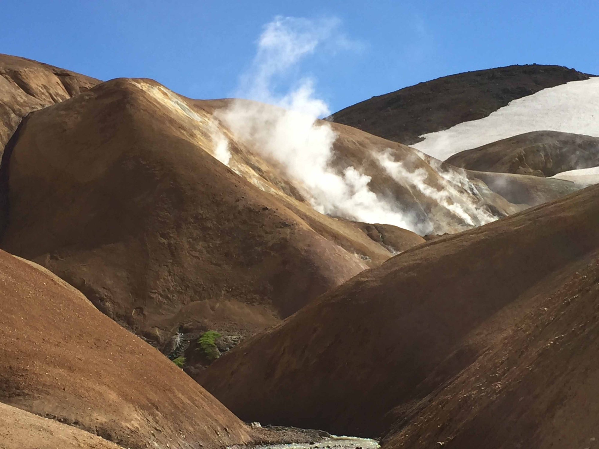 Wir fahren weiter und kommen an einen grün schimmernden Gletschersee, um den wir herum fahren. Kurz danach geht es rechts ab in die Berge zum Thermalgebiet Kerlingarfjöll. Wir stellen das Auto ab und wandern durch das Gebiet, in dem überall heiße Fumarolen aufsteigen, heiße Quellen blubbern und dampfen und die abgelagerten Mineralien die Landschaft bunt gestalten. hier kann man stundenlang wandern, ständig bergauf und bergab, manchmal sehr steil und anstrengend, aber da wir in unserem eigenen Tempo gehen, bleibt Zeit genug, die Schönheit der Gegend zu genießen. Hier ist der höchste Punkt des Gebirges Kjalvegur und die Wasserscheide. Höher als etwa 800 m geht es ab hier nicht. Man könnte jetzt über den Kamm zu einem Campingplatz mit Restaurant laufen, aber dann müsste wir zurück, um unser Auto zu holen. Daher kehren wir um und fahren um den Berg herum auf einer sehr engen Straße dort hin. Man kann dort an Picknicktischen in der Sonne sitzen. Wir genießen das unglaubliche Licht heute nachmittag und essen unser Sandwich. Wieder mal ein Paradies für Fotografen. Wir können uns kaum losreißen, aber es ist schon 16 Uhr und wir müssen die 200 km wieder zurück fahren. Aber der Rückweg geht schneller. Wir halten nur noch einmal am Gullfoss, der jetzt noch fotogener die schönsten Regenbogen in der Abendsonne malt. Auf die Idee sind auch noch viele andere gekommen, aber Busse sehen wir keine mehr. Wir nehmen jetzt den Rückweg über Selfoss und die Ringstraße. In Hvergerdi kurz vor Reykjavik halten wir an, um im Kjöt og Kúnst (Fleisch und Kunst), einem stylischen gemütlichen Restaurant zu Abend zu essen. Man backt hier in dem Thermalgebiet, das wir an einem anderen Tag noch erkunden wollen, in Erdöfen. Ich liebe das Brot und auch das Essen ist hervorragend. Zurück im Hotel können wir uns nicht aufraffen, nochmal in die Stadt zu gehen. Es ist Samstag ist und viel los, zudem noch taghell, jetzt um 22 Uhr, aber wir sind einfach zu müde. Es war ein toller Tag. Wir waren 14 Stunden unterwegs, sind 480 km gefahren und viel gewandert. Wir nehmen uns ein Getränk mit aufs Zimmer und schlafen fast ein, bevor es ausgetrunken ist.