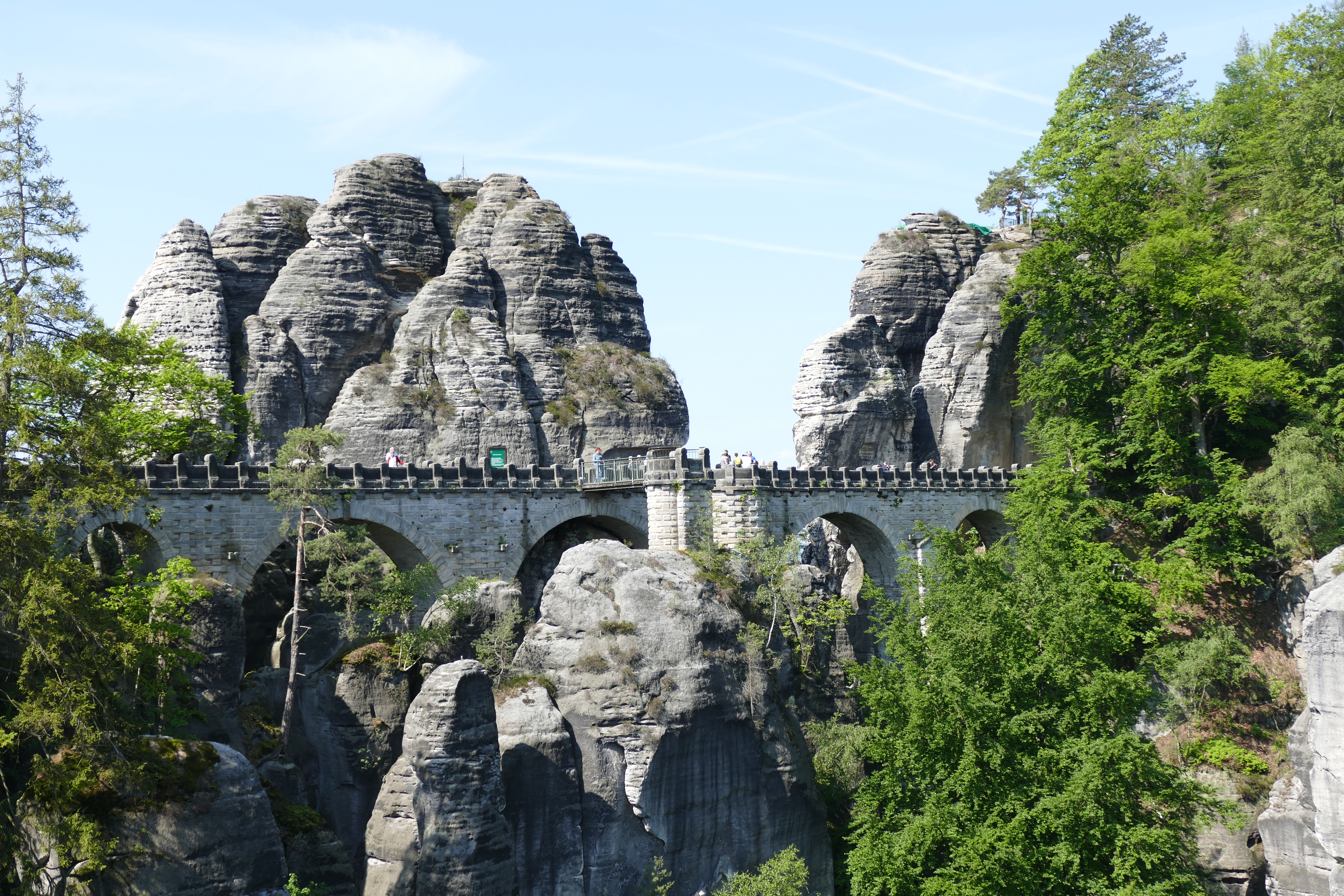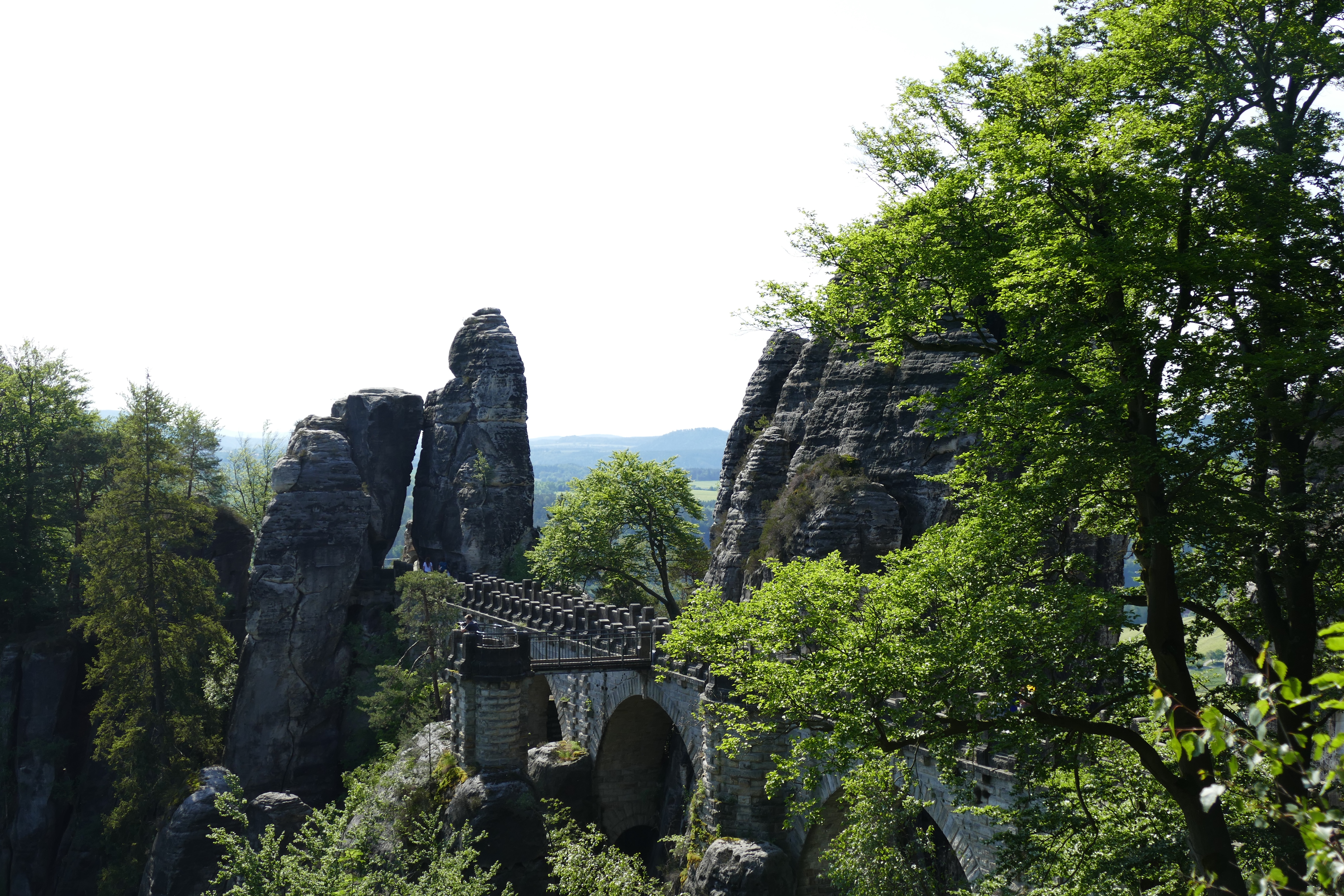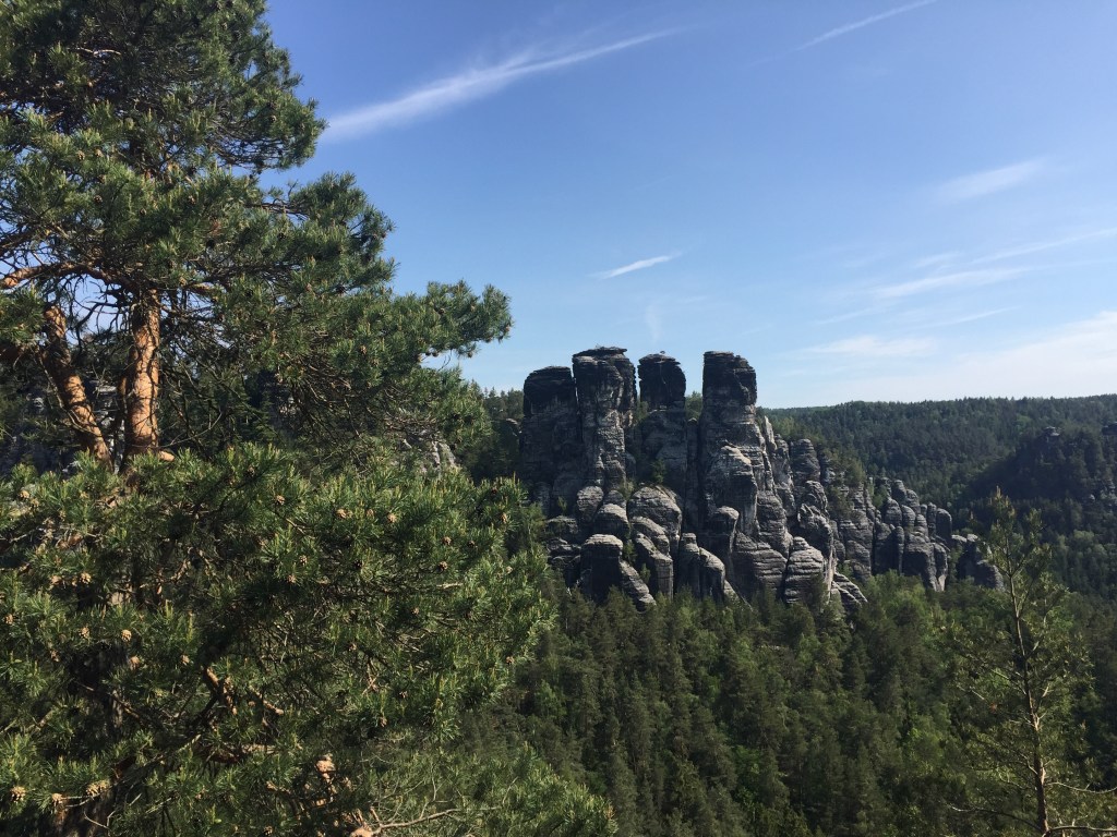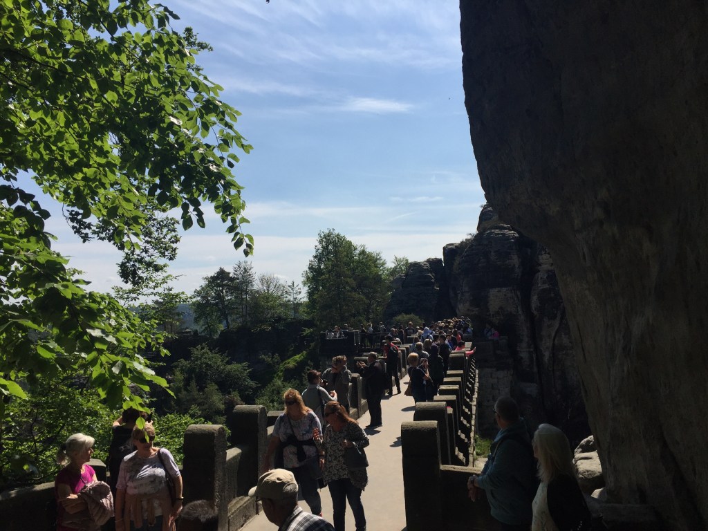 Die Bastei heute morgen ist super. Wir sind früh da und fast allein. Die spektakulären Felsformationen liegen fotogen in der Sonne und wir können die Ruhe genießen – bis 11 Uhr. Dann rollen Busladungen voll Asiaten und Osteuropäer an und vorbei ist es mit der Ruhe, was nicht an der Nationalität liegt, sondern an der Menge der Besucher. Schnell weg hier!