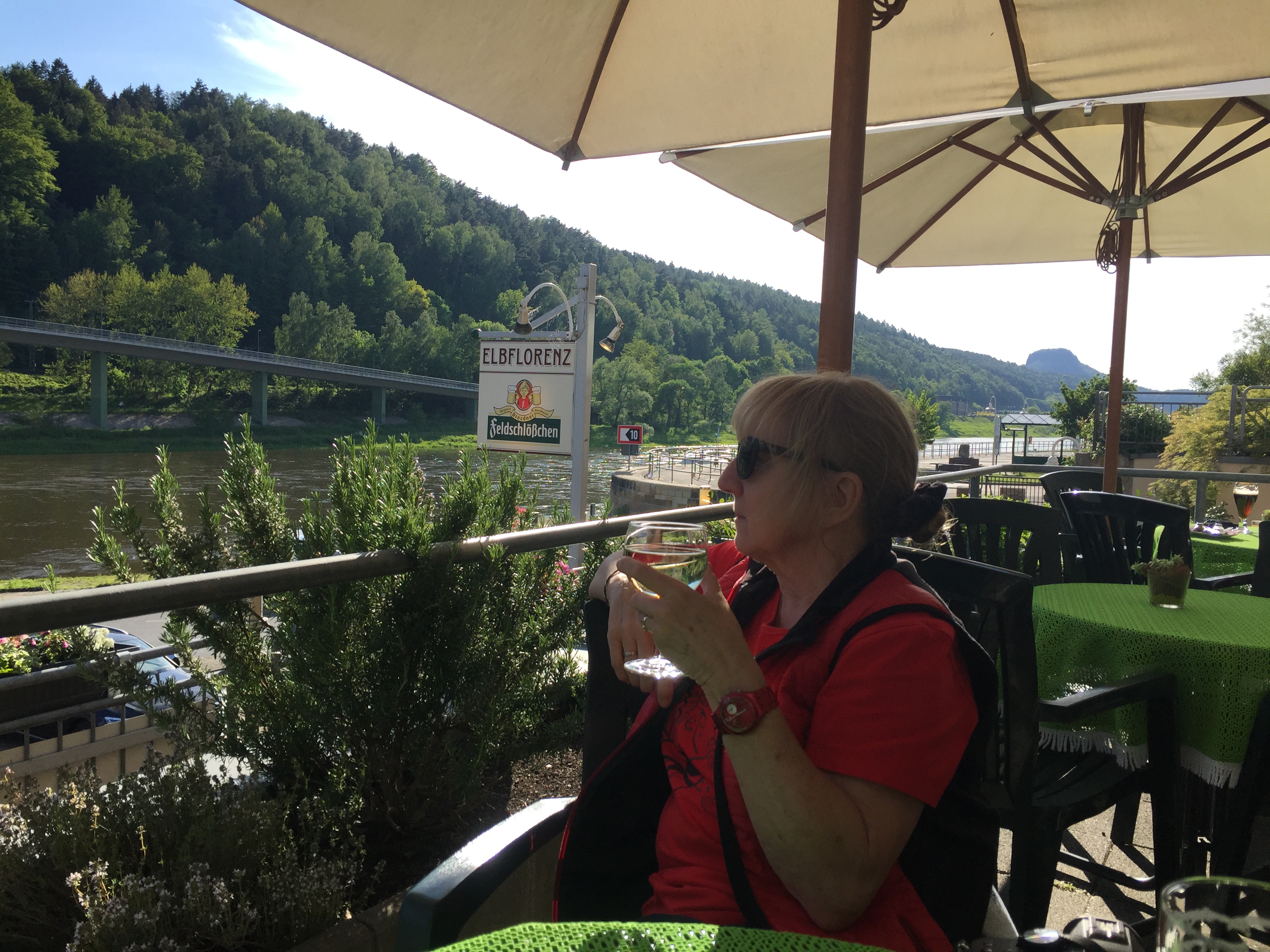 Wir sind schon um 13 Uhr da und gehen zum Mittagessen ins Restaurant Elbschlösschen, etwas rechts vom Fähranleger. Obwohl die Fähre schon ziemlich voll war, geht keiner in diese Richtung und wir sind fast allein dort. Sieht edel und teuer aus, aber das Essen ist hervorragend und nicht teurer als in anderen Lokalen, die Aussicht von der Terrasse traumhaft und wir genießen die Ruhe.
