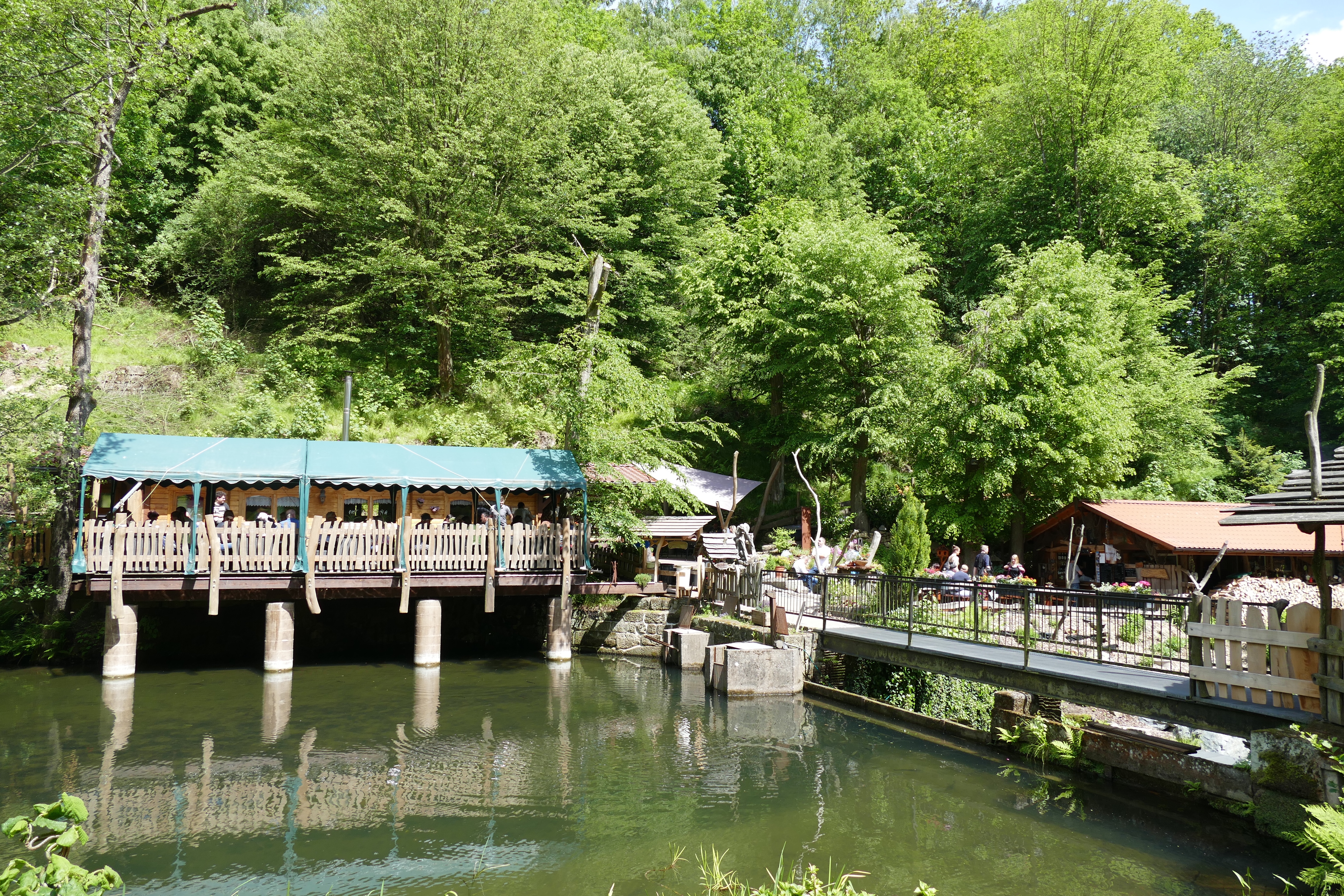 Heute morgen lassen wir es gemütlicher angehen. Wir frühstücken erst um halb neun und gehen dann zu Fuß zum Personenaufzug auf den Berg. Da wir nicht wandern wollen, was man von dort auch gut könnte, machen wir nur Fotos – man hat hier eine tolle Aussicht über Bad Schandau und die Elbe. Wir schauen uns noch den Luchs in seinem Gehege an. So ein schönes Tier und so wenig Platz! Wir fahren wieder runter und machen uns auf den Weg nach Rathen, wo wir für 16 Uhr Karten für „Winnetou 1“ auf der Felsenbühne haben. Da man dort nicht parken kann (nur auf dem kostenpflichtigen Parkplatz auf der anderen Seite der Elbe und dann mit der Fähre rüber), wollen wir die in der Karte enthaltene Zugfahrt nutzen. Dazu fahren wir mit der Fähre ( in der Gästekarte enthalten) rüber zum Nationalpark-Bahnhof und von da mit der S-Bahn nach Rathen. Dort müssen wir wieder mit der Fähre (2€ Rückfahrkarte) auf die andere Elbseite. Der Fußweg geht durch den Amselgrund dann nochmal etwa 30 Minuten den Berg hoch. Die Bühne liegt malerisch am Rand der Bastei und man kann Teile der Felsenburg und den Kletterfelsen sehen.