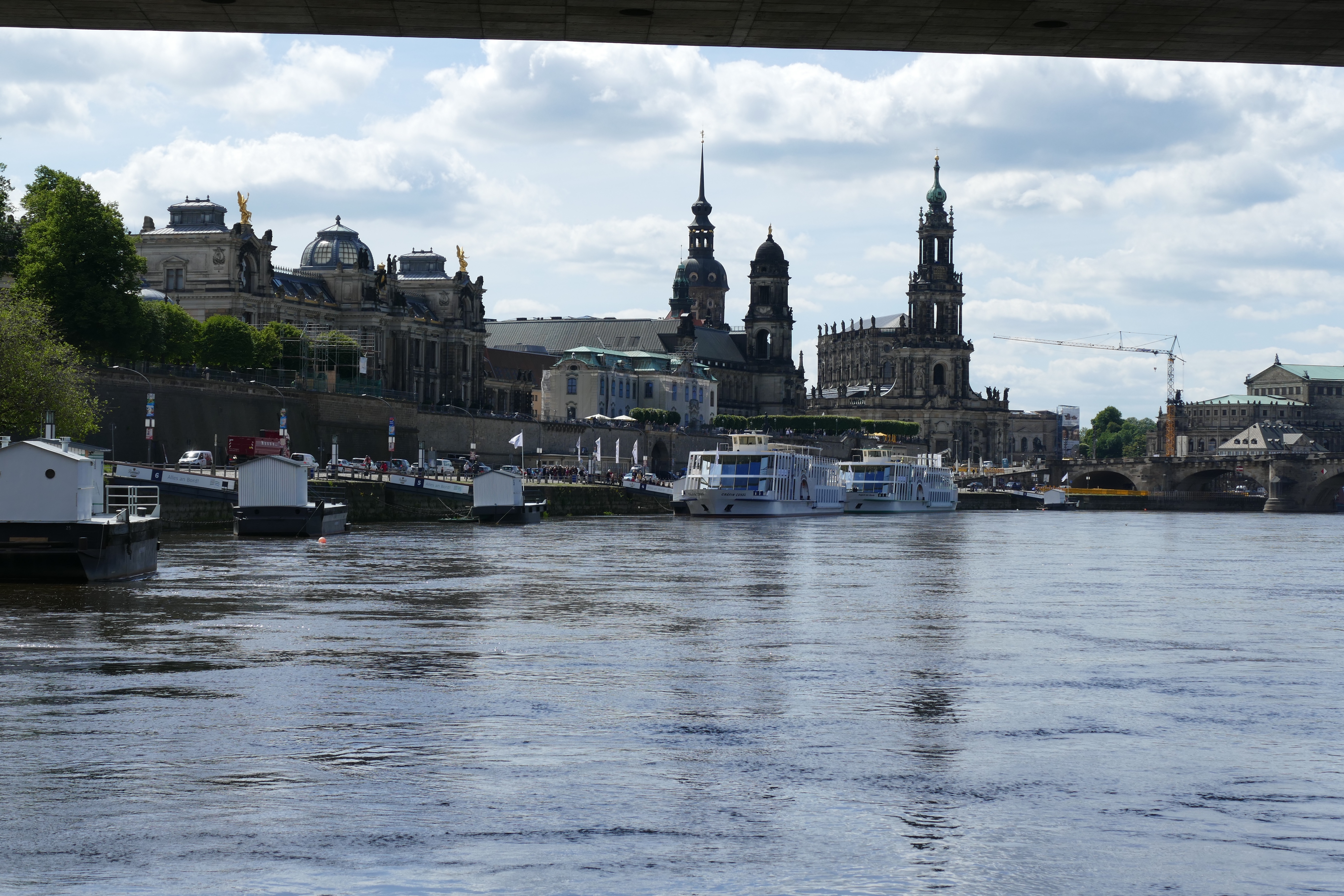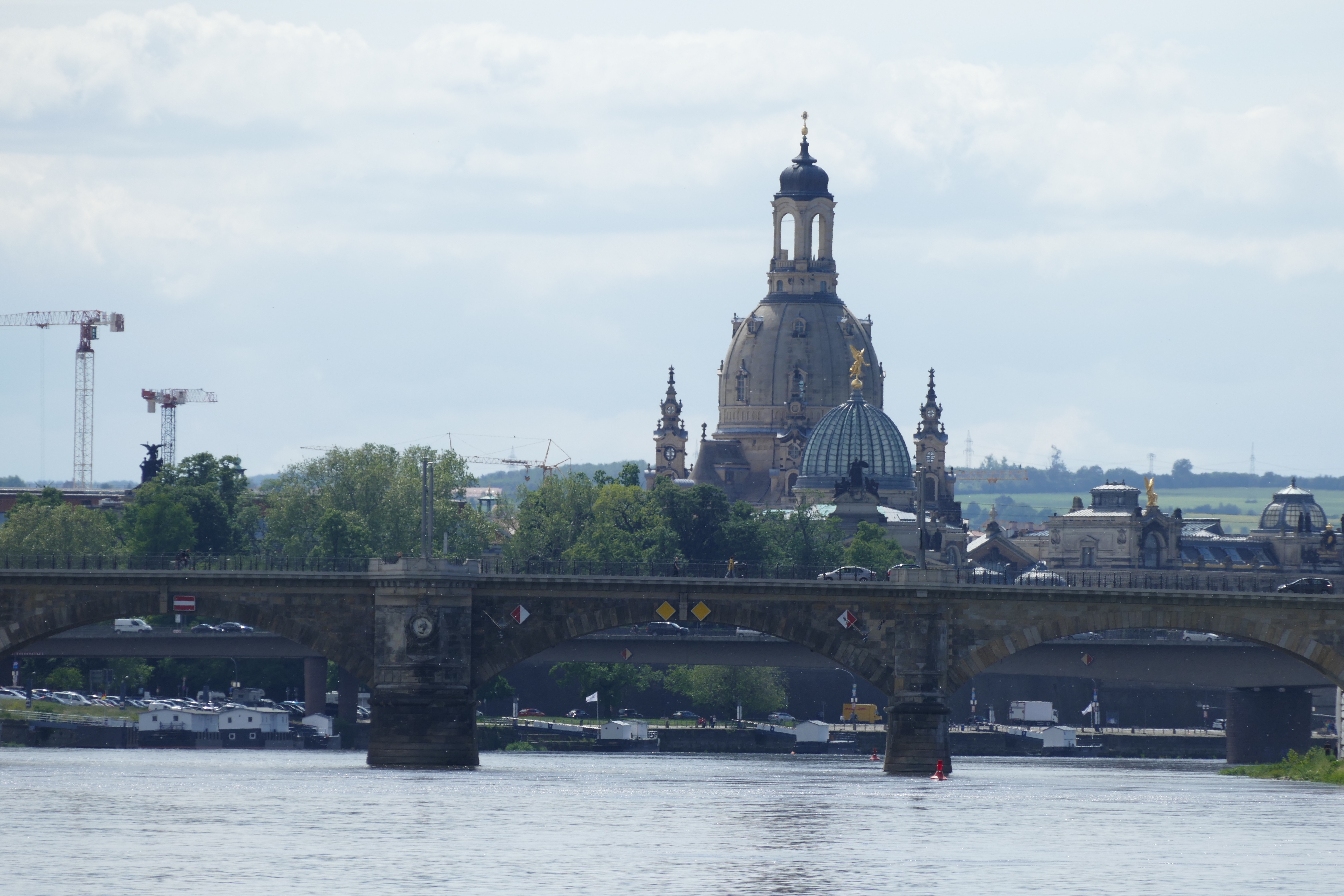 So früh am Morgen sind nur ganz wenige Menschen unterwegs. Wir gehen über die Parallelstrasse, die Königstrasse mit ihren vielen Restaurants zurück und finden auch die uns bekannten Lokale wieder: Die „Prager Bierstuben“ und das „Mama Africa“. Beide sind auch noch geschlossen, aber es scheint sich kaum etwas verändert zu haben. An der Elbe entlang mit einem tollen Blick auf die Skyline von Dresden (und den vielen Baukränen, die dort zur Zeit stehen…) gelangen wir wieder zur Augustusbrücke. Hier treffen wir die ersten „Vatertagsausflügler“ – Männergruppen, die mit Bollerwagen und reichlich Getränken unterwegs sind.