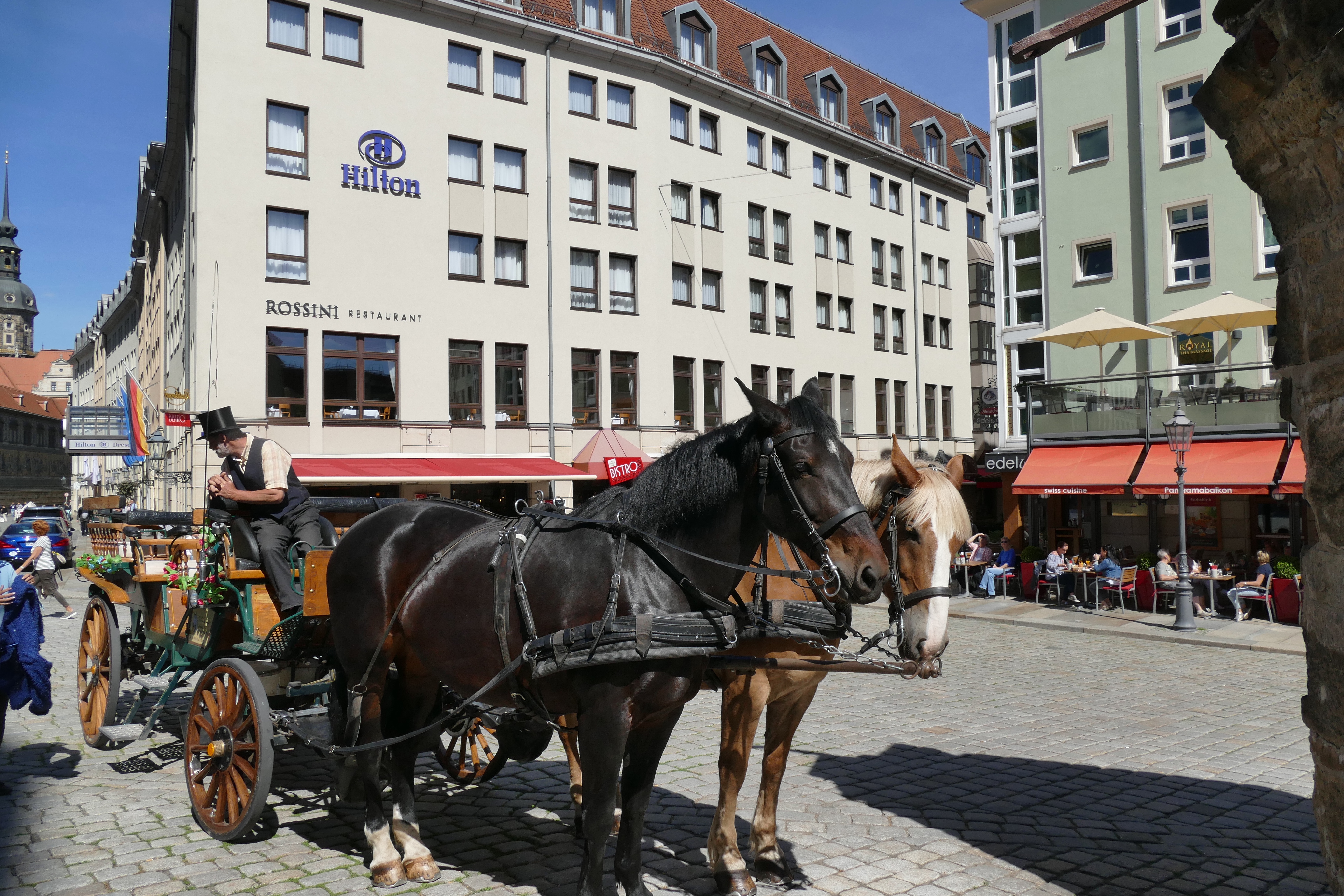 Wir fahren nach einem ausgiebigen Frühstück gegen 10 Uhr los. Auf dem Weg nach Dresden nehmen wir die Strecke über Sebnitz und Stolpen. Um 12 Uhr kommen wir schon im Hilton an der Frauenkirche an. Das Zimmer ist noch nicht fertig, also spazieren wir noch etwas durch die Stadt nachdem wir unser Auto in der (sehr engen) Tiefgarage geparkt haben. Die Parkgebühren sind für Hotelgäste unverschämt hoch: 25€ pro Tag, aber was bleibt uns übrig? Es gibt keine Alternative.
