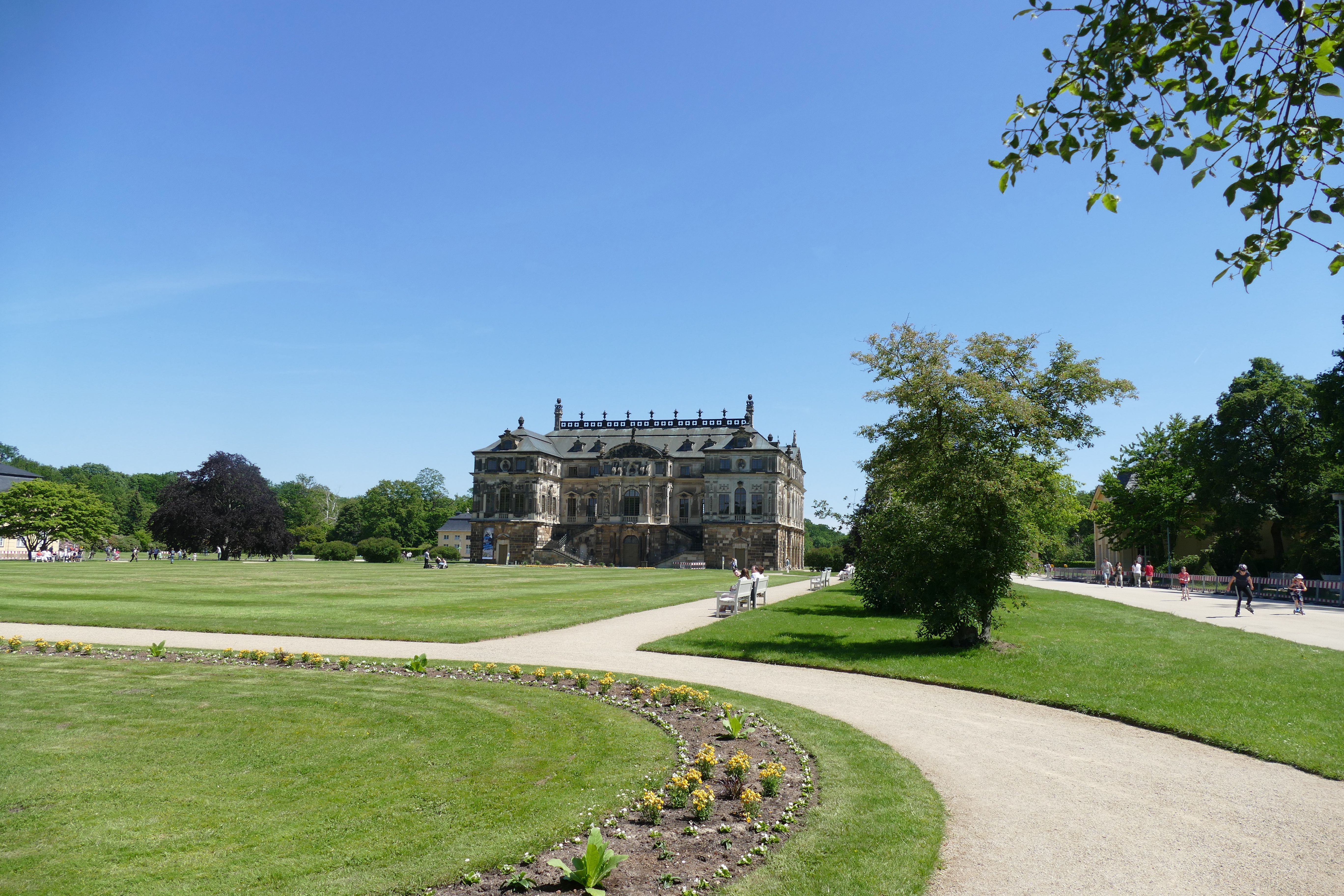 Da mein Knie Probleme macht, lassen wir die geplante Radtour ausfallen und fahren mit dem Auto zu „Großen Garten, wo wir eigentlich mit der Dampfeisenbahn fahren wollen. Aber die hat heute Ruhetag wegen Christi Himmelfahrt. Also laufen wir nur einmal um das Palais herum.