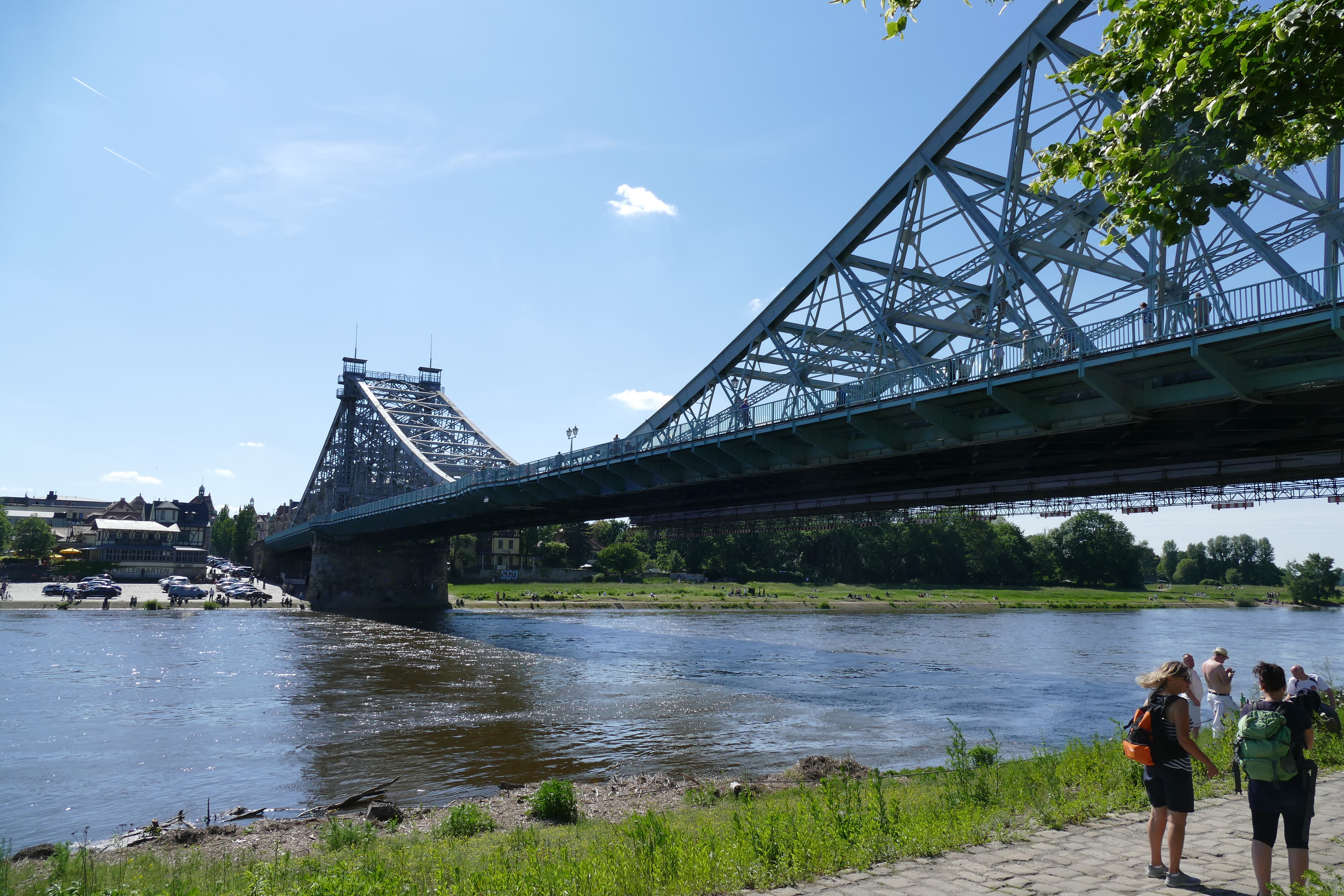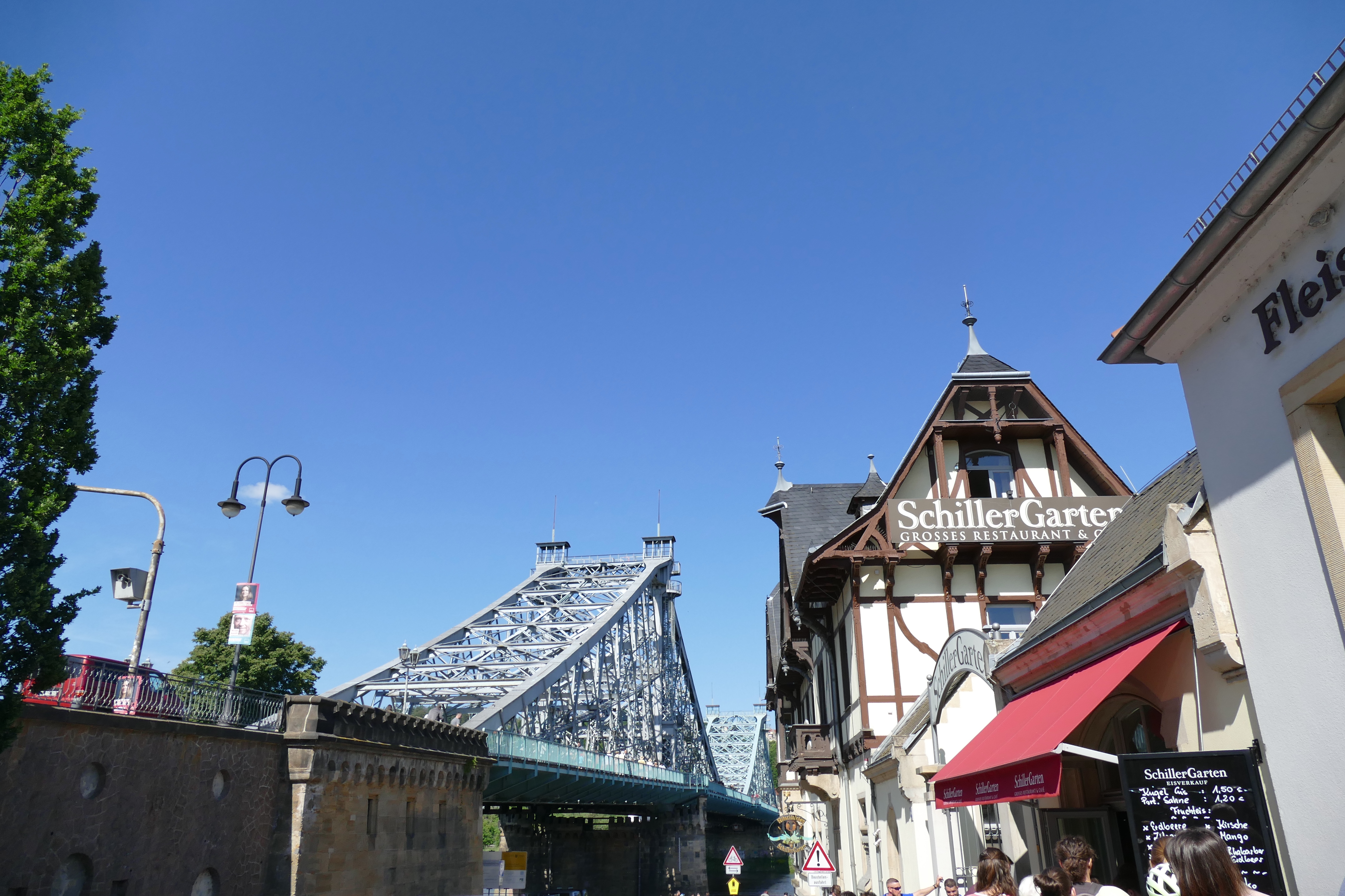Dann fahren wir zur Elbbrücke „Blaues Wunder“. Sie heißt eigentlich Loschwitzer Brücke und verbindet die Stadtteile Blasewitz am linken und Loschwitz am rechten Ufer. Sie inzwischen neben der Frauenkirche, dem Zwinger und dem Goldenen Reiter ein Wahrzeichen von Dresden. An den beiden Ufern befinden sich mehrere Ausflugslokale. Eins davon ist der Körnergarten, der aus den Tatortkrimis mit Kommissar Ehrlicher bekannt ist und auf der anderen Seite der riesige Schillergarten. Erstaunlicherweise bekommen wir in der Nähe auf der Fidelio-F.-Finke-Straße für 25 Cent pro Stunde einen Parkplatz. Die Lokale sind jetzt zu Mittag brechend voll mit Vatertagsgruppen und man merkt, dass viele davon schon länger (mit entsprechender alkoholischer Verpflegung) unterwegs sind. Trotzdem mischen wir uns darunter und essen ein Eis im Körnergarten, wo eine Männergruppe höheren Alters in Frack und Zylinder (bei 30 Grad Hitze!) die Gäste mit deutschen Volksliedern unterhält. Dann spazieren wir über die Brücke zum Schillergarten, wo wir aber ganz schnell wieder das Weite suchen, da es uns zu laut und wuselig ist. 8 Securityleute sorgen hier für Ordnung – schade, dass das nötig ist! Auf der Elbe fahren adrenalin- und hormongesteuerte alkoholisierte junge Männer mit Speedbooten wilde Figuren, so dass ein paar Paddler in Bedrängnis kommen. Eine andere Gruppe, die am Ufer gegrillt hat, lässt ihren Müll einfach dort liegen. Dieser Tag ist nicht wirklich eine gute Wahl für einen geruhsamen Ausflug hierhin! Dabei ist die Gegend so schön. Man könnte auch noch mit einer Bahn auf den Berg zum Edel-Stadtteil „Weißer Hirsch“ in Loschwitz fahren, um die Aussicht von oben zu genießen. Das haben wir letztes Mal gemacht, daher brechen wir hier ab und fahren zurück in die Innenstadt.