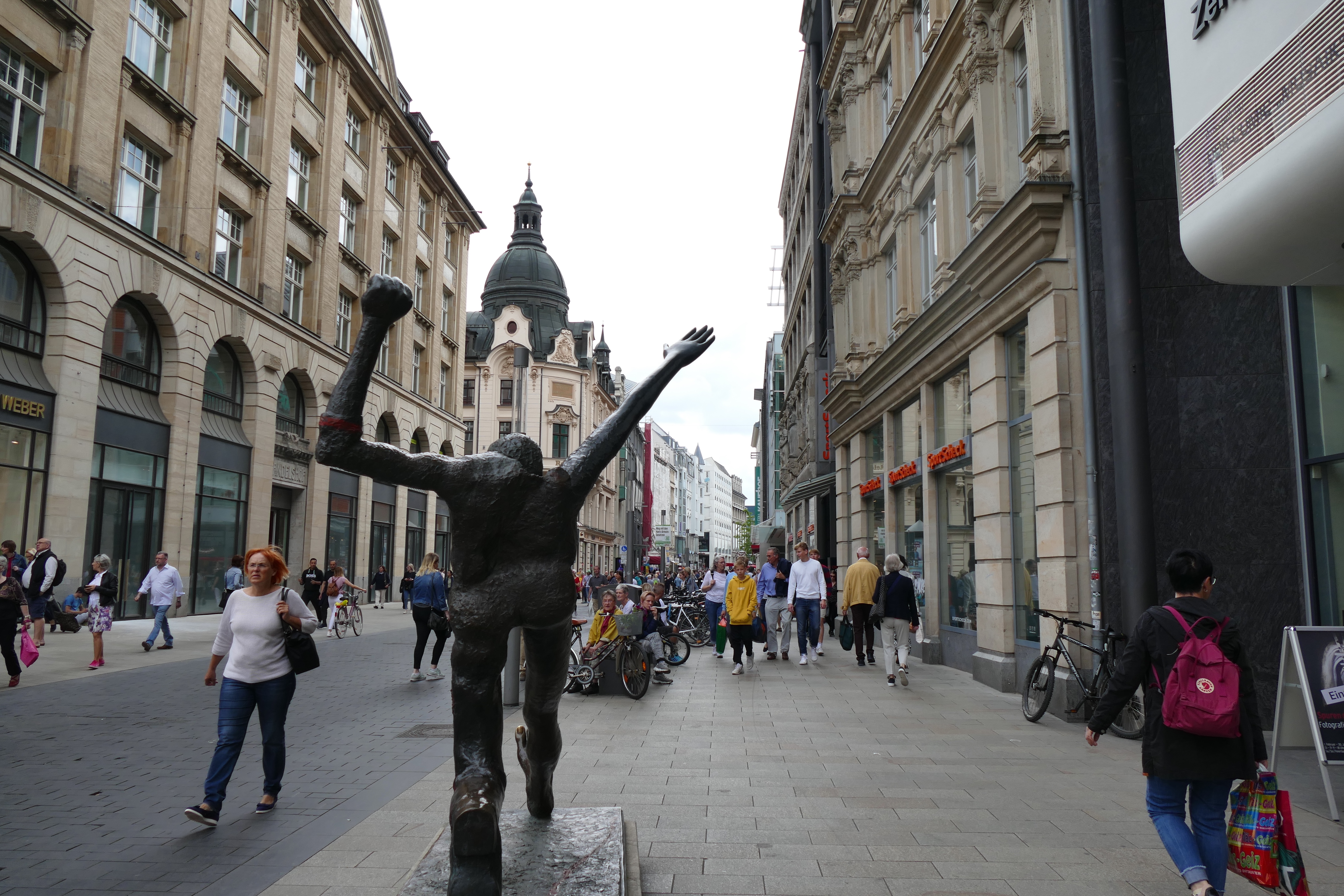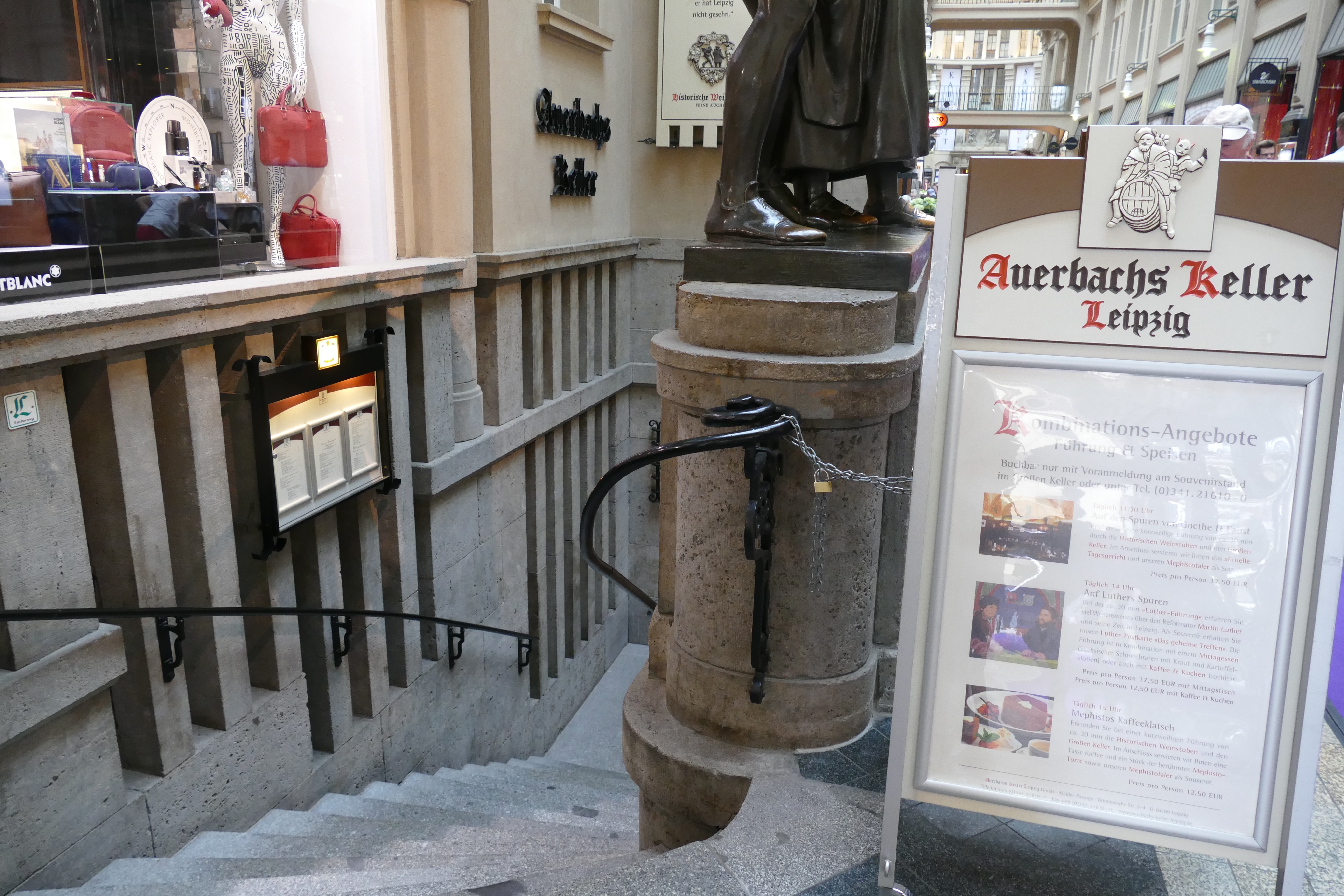 Zu Fuß machen wir uns auf in die Innenstadt – und mit uns Massen von Menschen aus Richtung Bahnhof. Die Stadt ist voll! Viele haben wohl das Brückenwochenende für einen Kurztrip oder Shoppingtag genutzt. Auch wir bummeln etwas durch die Läden und gehen dann zum Mittagessen in das historische Restaurant „Auerbachs Keller“ in der Mädler Passage – das ist Pflicht für einen Leipzigbesucher. Goethe war hier schon ein gern gesehener Gast, was man an den Skulpturen am Eingang sieht. Wenn man dort abends hin will, muss man unbedingt mehrere Tage im Voraus reservieren, aber Mittags geht es auch ohne. Wir sind angenehm überrascht. Obwohl es eine touristische Hochburg ist, ist die Atmosphäre gut und das Essen hervorragend und gar nicht teuer. Nach dem nicht so gelungenen Auftakt genießen wir den Aufenthalt hier bei einem Wildschweinbraten.