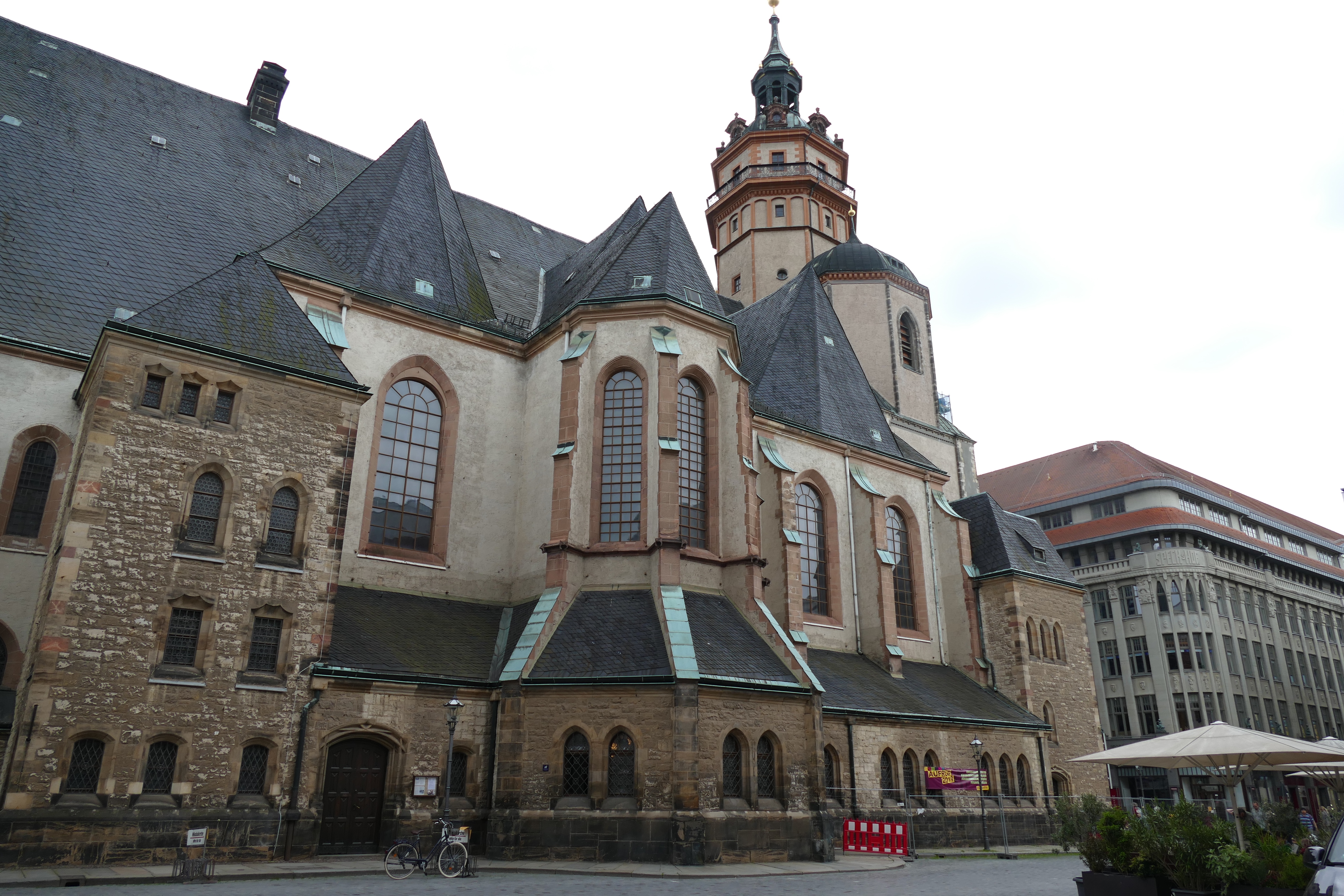Erst mal die Nikolaikirche, die älteste Kirche Leipzigs, überall bekannt geworden im Herbst 1989 als zentraler Ausgangspunkt einer friedlichen Demonstration mit anschließendem Mauerfall.