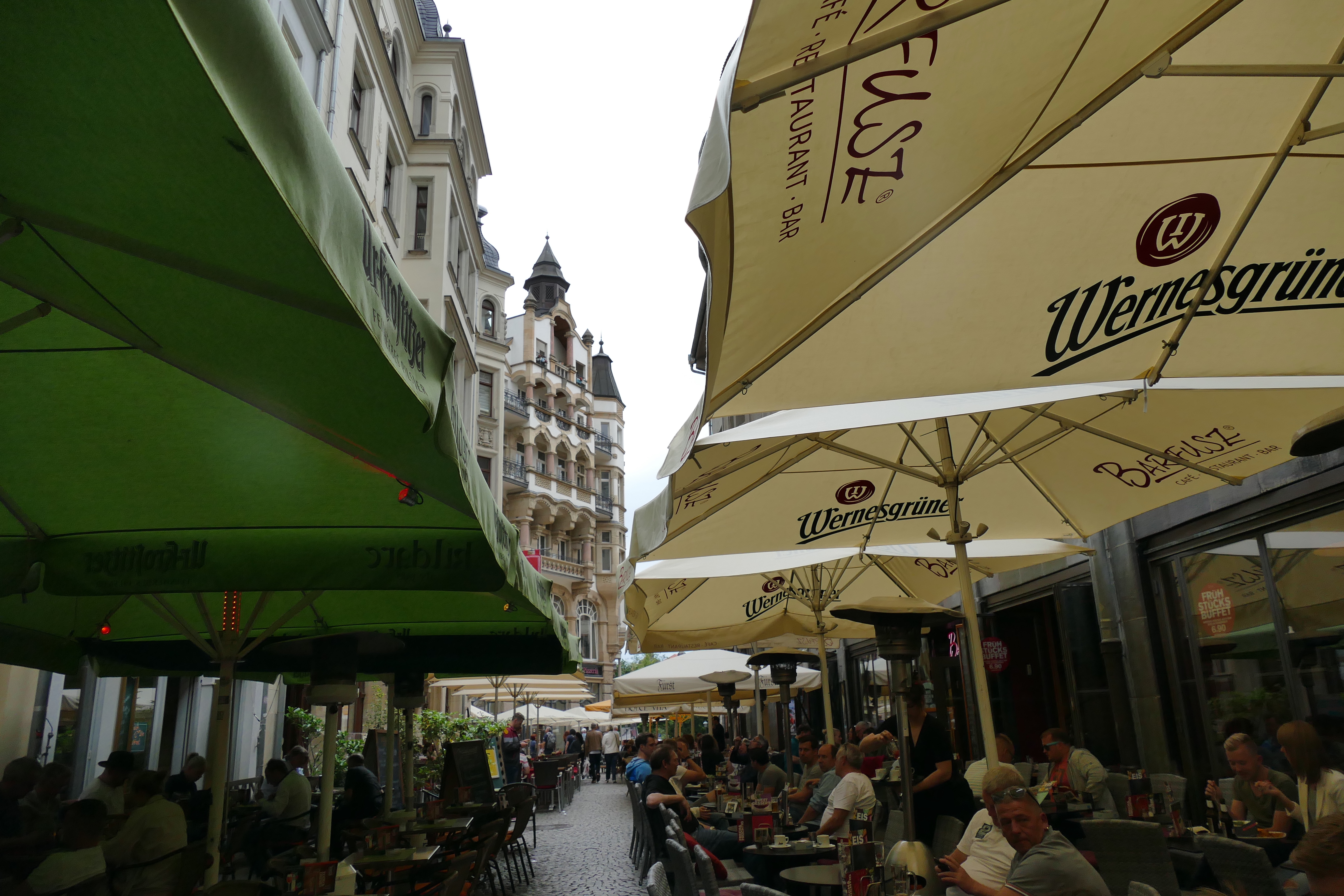 Zum Schluss das Barfußgässchen, einer Kneipenstrasse, wo sich Tisch an Tisch reiht. Dort ist es so voll, dass man kaum hindurch gehen kann. An einen freien Tisch erst mal gar nicht zu denken. Erst vor der Thomaskirche wird es wieder etwas weniger überfüllt und wir gehen auf ein Eis in die Eisdiele.