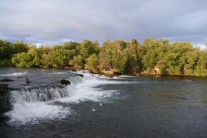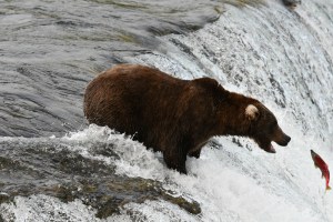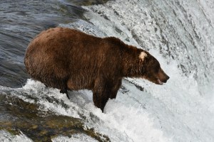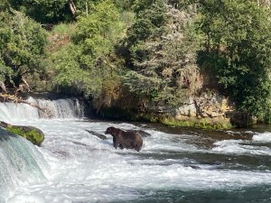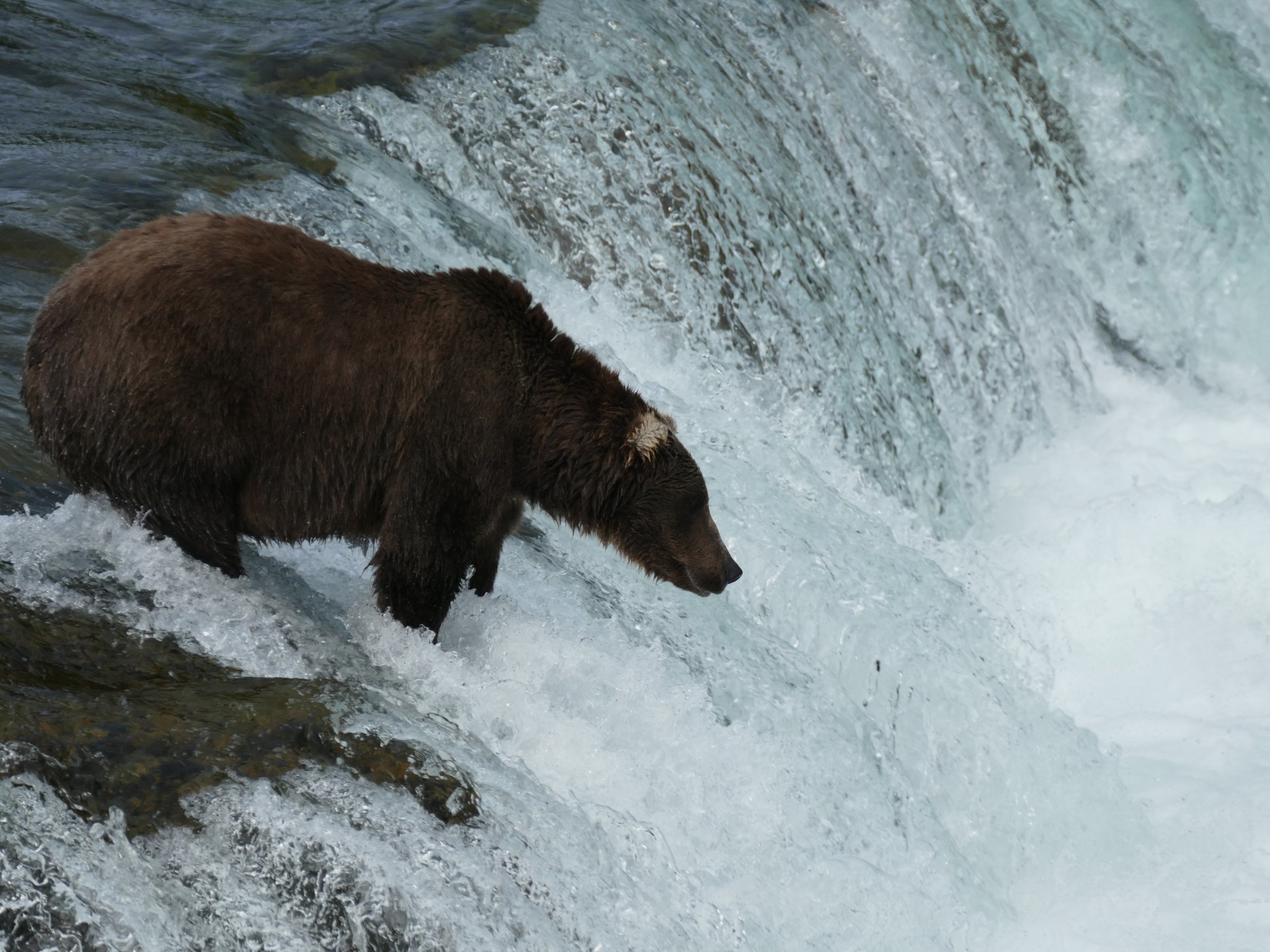 Aber wir wollen ja noch weiter. Auf der Platform treffen wir noch auf etwa 20 Leute, das ist übersichtlich. Im Hochsommer tummelt sich hier ein Vielfaches an Besuchern, und man muss sich in eine Liste eintragen. Wenn man dann an der Reihe ist, hat man eine halbe Stunde zum Schauen. Heute können wir bleiben so lange wir wollen. Allerdings ist momentan auch nur eine Bärin da, die aber äußerst fotogen in der Abendsonne am Rand des Wasserfalls steht und versucht, die hochspringenden Lachse zu fangen – genau so, wie man es sich vorgestellt hat. Ihre auffallend blonden wuscheligen Ohren glänzen im Sonnenlicht.