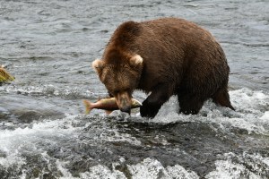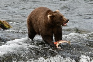 Wir essen unsere Kuchenreste, packen und checken aus. Das Gepäck wird von den Mitarbeitern aus der Hütte geholt. Zum Abschied regnet es auch noch immer mal wieder! Trotzdem gehen wir noch ein letztes Mal zu den Fällen. Wir schauen eine ganze Weile dem einzigen Bären zu, der heute zu sehen ist. Es ist wieder der mit der Narbe, der unermüdlich einen Lachs nach dem anderen frisst. Es ist spät im Jahr und er will noch genug Fett ansetzen, um den Winter gut zu überstehen. Er ist schon ziemlich dick und ich glaube, er wird keine Probleme haben.