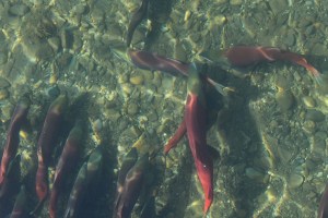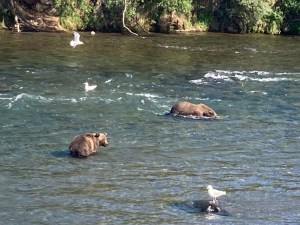Recht früh machen wir uns auf zu den Bären. Es ist tolles Wetter, was schon mal enorm die Laune hebt. Ganz am Anfang neben der Brücke an der Lodge tummeln sich drei Bären. Eine Menge roter Lachse schwimmen im flachen Wasser. Wir schauen den fischenden Bären zu bis sie im Wald verschwinden – dort, wo wir jetzt gleich hin wollen. Noch sind keine Tagesausflügler unterwegs, so dass wir den Weg wieder allein gehen. Wir befolgen die wichtigste Regel und unterhalten uns laut, damit wir kein Tier überraschen. Ich möchte auch nicht wirklich gern einem auf dem Weg begegnen, weil man dann nach links oder rechts ins Gebüsch ausweichen muss, bis er vorbei ist. Und das kann dauern, wenn es ihm einfällt, dort mal kurz einen kurzen Nap zu machen. Wenn man also einen Termin wahrnehmen muss (Abflug oder Ausflug) sollte man Extrazeit einplanen für den Weg.