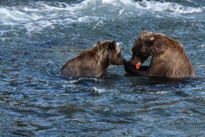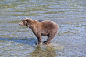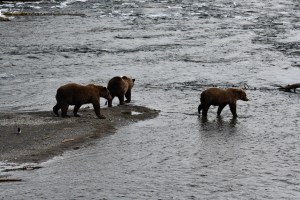 Andere Gäste nennen sie Beady Bunch, den anderen Walker oder Chunk oder benennen ihn mit einer Zahl. Für mich ist es schwierig sie zu unterscheiden und ich genieße das Treiben, egal wie der Bär heißt. Später gesellt sich die Bärin mit den blonden Ohren von gestern noch dazu und etwas weiter flussabwärts jagt ein weiterer im flachen Wasser umher.