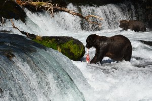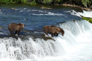 Da der Sonnenuntergang hier zur Zeit etwa um halb 10 abends ist, schenken wir uns das Abendessen, das sowieso in ein paar Minuten zu Ende wäre, legen das Gepäck in die Hütte und schnappen uns die Kameras. Es ist ein schöner sonniger Abend und wir wollen noch zu den Falls. Etwas mulmig ist uns schon, hier so allein 1,2 Meilen durch den Wald zu laufen, wo wir an jeder Ecke auf Bären treffen könnten. Vom Boardwalk aus direkt hinter der Lodge sehen wir zwei Bären, die im See auf Jagd nach Lachsen sind. Wir beobachten sie eine Weile.