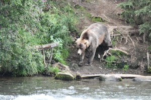 Trotz der anstrengenden Wanderung machen wir uns nach einer kurzen Rast noch einmal auf zu den Wasserfällen. Die Sonne scheint jetzt, aber es gibt auch viele Mücken, da es überall noch nass ist. Viele Leute kommen uns entgegen und die Platform ist ganz leer, aber leider ist auch nur ein Bär zu sehen (Chunk, sagte man uns – mit einer auffallenden Narbe auf der Schnauze). Nach einiger Zeit gesellt sich nochmal unser „Goldohr“ dazu und ein weiterer. Gegen halb 8, als die Platform sich wieder füllt mit den Gästen, die in der Lodge gegessen haben, ziehen wir uns zurück in den vorderen Teil. Wir beobachten noch zwei Angler, die von einem Bären auf einer Halbinsel wohl etwas in die Enge getrieben wurden. Auf der einen Seite Wasser, auf der anderen der Bär. Sie waten durch das hüfthohe Wasser an einer anderen Stelle zum Ufer und der Bär trollt sich den Weg entlang, auf dem wir gerade gekommen sind.