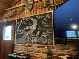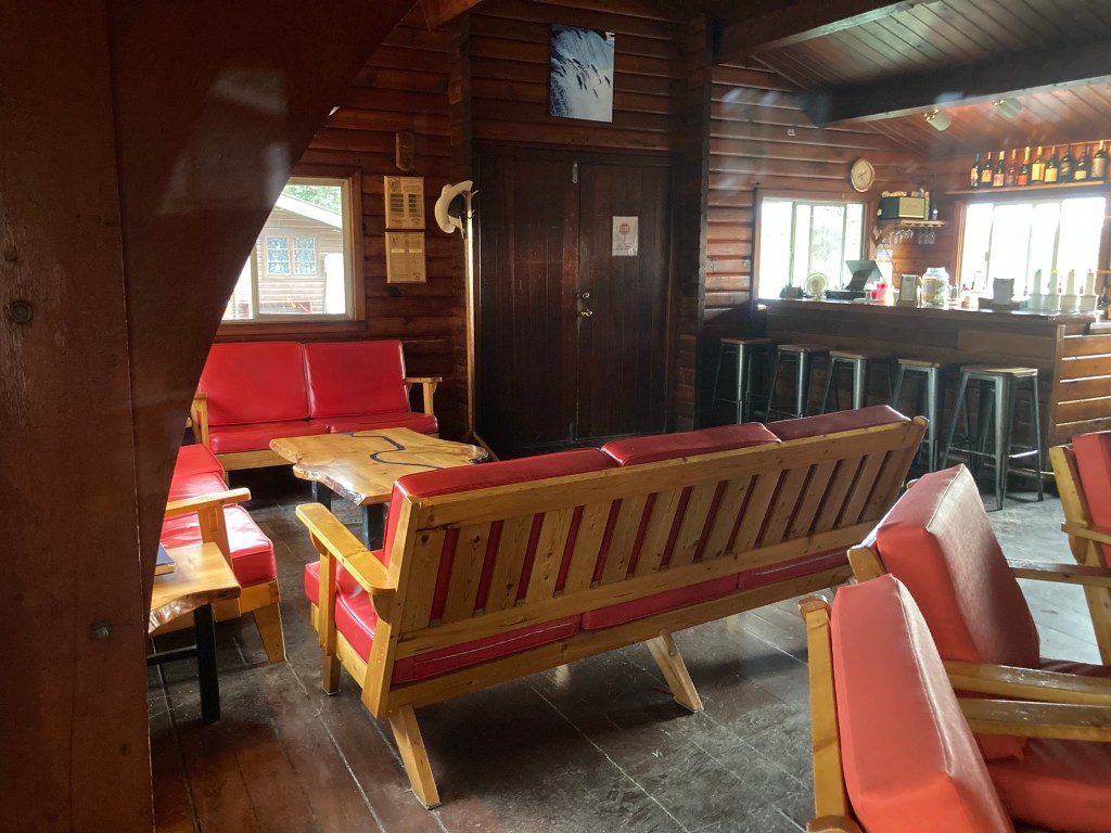 Die Sonne geht langsam unter und wir machen uns auf den Weg zurück zu unserer Hütte. Dort sind wir froh, dass wir Käse und Cracker haben für ein verspätetes Abendessen. Schließlich hatten wir den ganzen Tag über nichts gegessen. Gemütlich lassen wir den Tag dann noch am Kaminfeuer im Haupthaus ausklingen. Bier und Wein oder Cocktails sind relativ teuer (9-12 Dollar), aber Kaffee, Kakao und Tee bekommt man soviel man möchte umsonst.