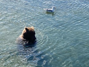Nach unserem Galaessen auf dem Zimmer (Käse und Cräcker) wollen wir den Weg nicht noch einmal laufen und pendeln zwischen Strand und vorderem Boardwalk, wo sich auch drei Bären aufhalten.