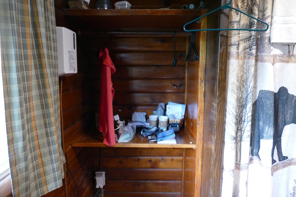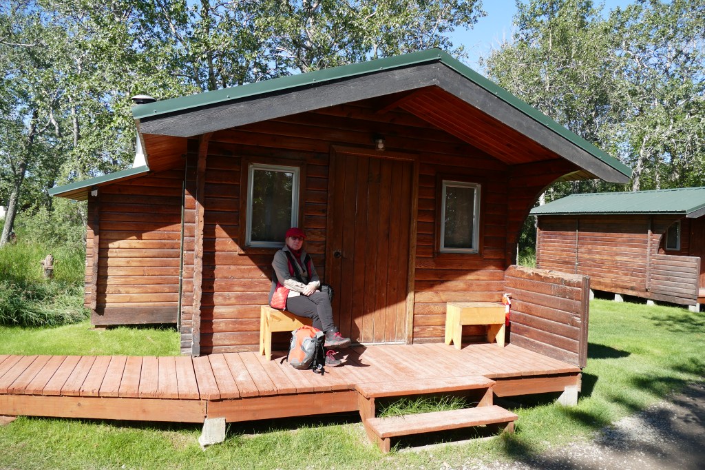 Zurück in der Hütte richten wir uns erst mal ein. In dem kleinen Raum stehen 2 Stockbetten (mit Bettzeug). Eine Holzwand, die nicht bis zur Decke reicht, trennt den Schlafbereich vom Bad mit einer Toilette, Waschbecken und Dusche mit Handtüchern und Waschartikeln. Hier steht auch noch eine Art Schreibtisch und ein Stuhl. Mit 4 Personen möchte ich hier nicht wohnen. Immer wieder findet man in Facebookgruppen Leute, die nach Mitreisenden suchen um sich die Kosten für ein Cabin zu teilen. Das würde ich mir gut überlegen. Privatsphäre gibt es nicht. Aber für uns beide ist es ganz gemütlich. Das obere Bett benutzen wir als Kleiderablage. Mein Rucksack fungiert als Nachttisch. Wir schlafen sehr gut.
