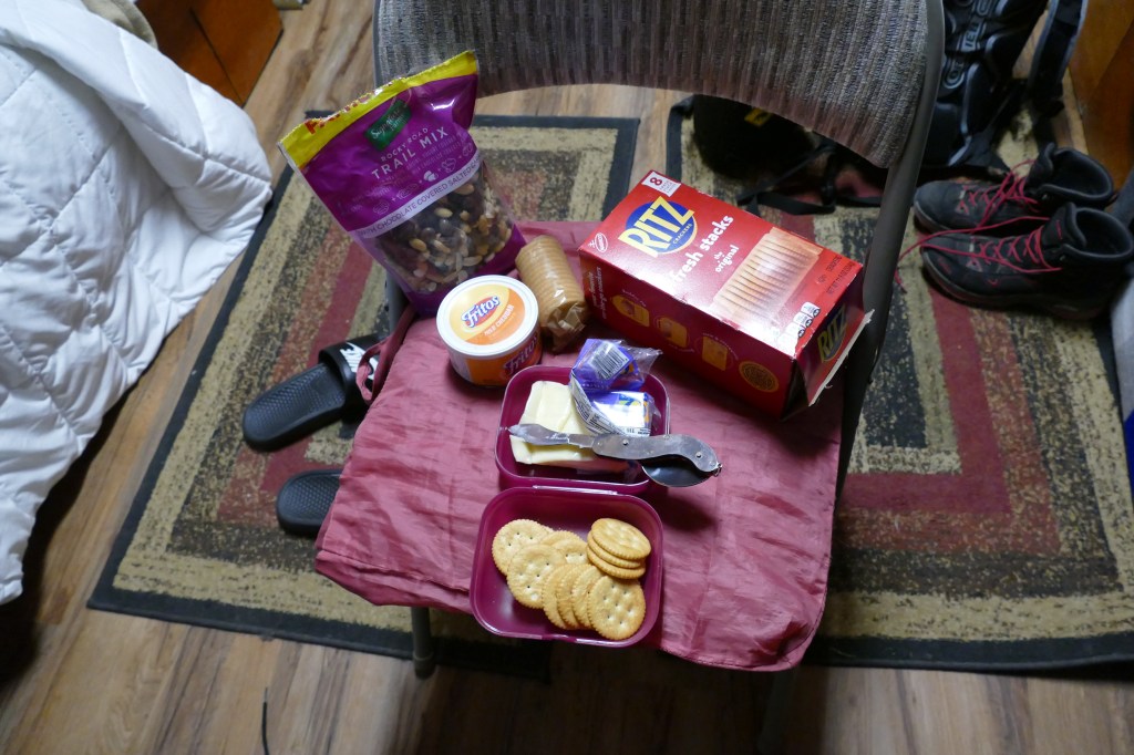Zum Abendessen gibt es alle Käse- und Cräckerreste, die wir morgen nicht wieder mitnehmen wollen. Nach einem Blick auf den vorderen Boardwalk, wo nichts mehr los ist, beenden wir den Abend wieder in der Lodge vor dem Kaminfeuer.