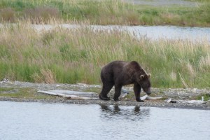 Da inzwischen die drei Bären vom Morgen wieder im Wald verschwunden sind, gehen wir zurück Richtung Lodge. Am vorderen See treffen wir sie dann wieder. Viele Gruppen von Menschen kommen uns jetzt entgegen, neben Anglern auch eine Menge Tagesgäste in Shorts und Sandalen, die wie ein Parfümladen riechen. Merkwürdig, dass da kein Ranger in der Bearschool etwas sagt – immer wieder heißt es doch eindringlich: Nichts stark riechendes mitnehmen – nicht mal ein Kaugummi sei erlaubt. Wir kennen die Regeln von anderen Gebieten, wo das akribisch kontrolliert wurde. Offenbar will man es sich inzwischen nicht mit den immer zahlreicher werdenden (gut zahlenden)Touristen verscherzen. Nur eine Frage der Zeit, dass es zu kritischen Begegnungen kommen wird. Aber dann wird mit Sicherheit wieder das Tier darunter leiden indem man es wegschafft oder sogar tötet.