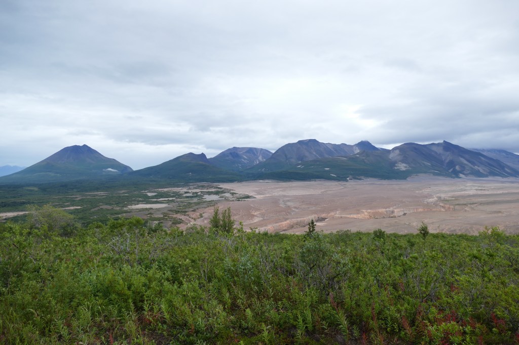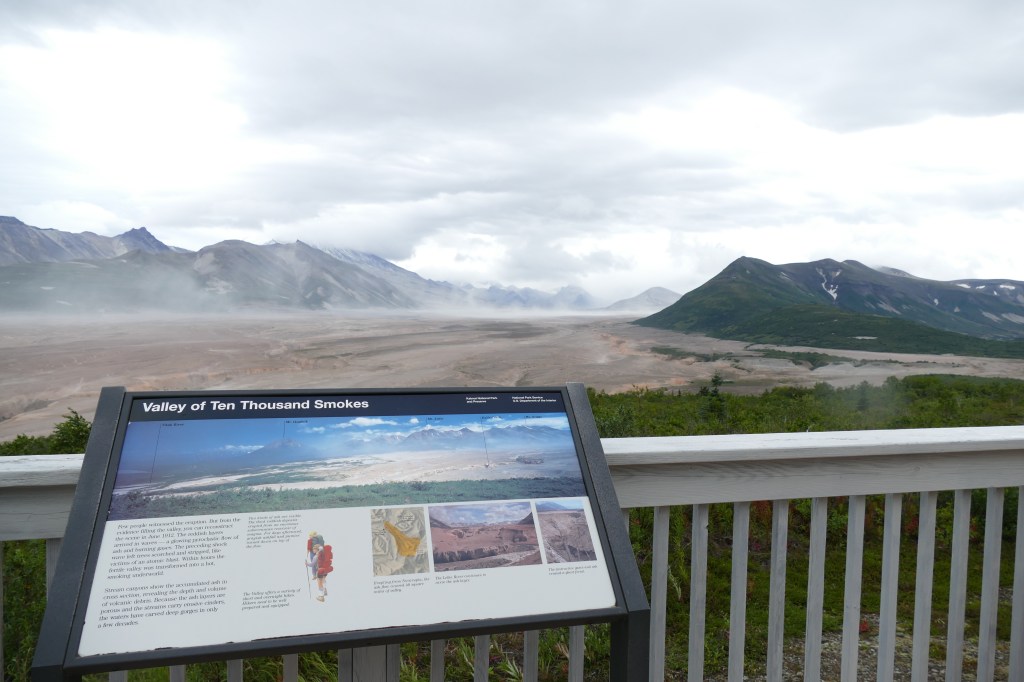 Der zweite Tag begrüßt uns leider mit Regen. Heute um 9 Uhr soll unser Ausflug zum „Valley of the 10000 Smokes“ starten. (etwa 100 Euro p.P.) Dick in Regenklamotten gehüllt gehen wir Richtung Treffpunkt, wo eine Art alter Schulbus auf uns wartet. Unser „Blondohr“ fischt schon im See. Den Bären ist das Wetter egal. Im Bus sind noch etwa 10 Leute. Ein paar haben (wahrscheinlich wegen des Regens) abgesagt.
