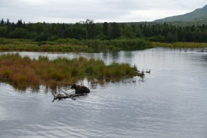 Zunächst klappt alles prima. Wir deponieren unsere Koffer im Hotel, nehmen unsere kleinen Reisetaschen, checken aus und fahren zum Parkhaus. Die Übergabe geht sehr schnell und im Gegensatz zu Frankfurt sieht hier alles vertrauenserweckend aus. Wir werden zum South-Terminal gebracht und sind viel zu früh am Schalter von ACE (Alaska Central Express). Hier ist nichts, wo man sich mal einen Kaffee holen kann, also laufen wir die endlosen Gänge zum North-Terminal entlang und warten dort in einem Cafe. Beim Zurückkommen erfahren wir, dass der Flug mehr als 2 Stunden Verspätung hat. Das Wetter kann es nicht sein – es ist sonnig und alle anderen Flüge finden statt. Zumindest können wir das Gepäck abgeben. Niemand sagt uns einen Grund. Nach endloser Wartezeit heißt es dann, dass wegen Maschinenschaden hier heute nichts mehr geht. Man hat uns umgebucht auf Katmai Air. Na super! Bis alle ihr Gepäck wieder haben, zum anderen Terminal gefahren wurden und dort das ganze Checkin Prozedere noch einmal durchgemacht haben ist wieder eine Stunde vergangen. So langsam sind alle sauer – bei einem Preis von 1000$ pro Tag in der Lodge ist es mehr als ärgerlich, den ganzen ersten Tag zu verlieren. Um halb 4 starten wir endlich – aber der Pilot muss noch kurz einen Zwischenstop einlegen um irgendwo in der Wildnis etwas abzuliefern.