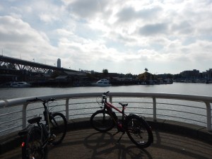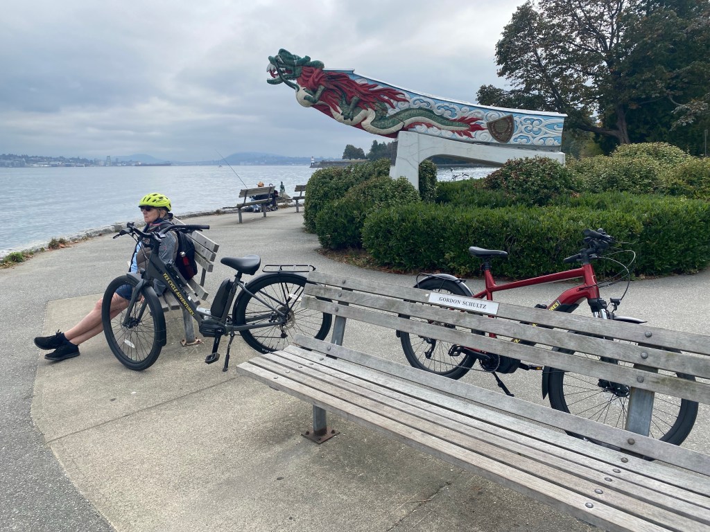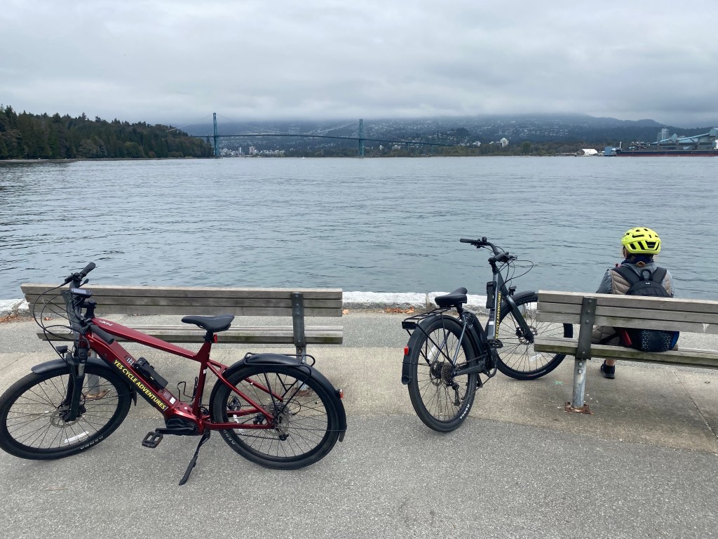 Am nächsten Tag ist es bedeckt, aber die Wettervorhersage ist gut. 100m neben unserem Hotel ist ein E-Bike-Verleih. Wir mieten zwei wirklich gute Bikes für 84$ pro Rad aus, um den Stanley Park zu erkunden, der direkt hinter der Bike-Station über Radwege gut zu erreichen ist. Wir bekommen eine gute Einführung und Helme, die im Mietpreis eingeschlossen sind. Eigentlich wollten wir, da wir nur im Park unterwegs sein wollen keinen Helm, aber der Vermieter sagt, es sei Gesetz in Kanada und er müsse sie uns geben. Wir sehen aber einige Radfahrer ohne Helm mit Citybikes, die in der ganzen Stadt stundenweise per App auszuleihen sind. Man sagt uns hier aber, dass wir ohne Helm nicht versichert seien. Ich sollte später noch feststellen, dass es gut war, den Kopf geschützt zu haben.