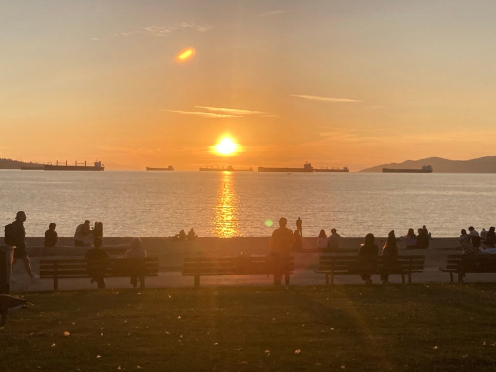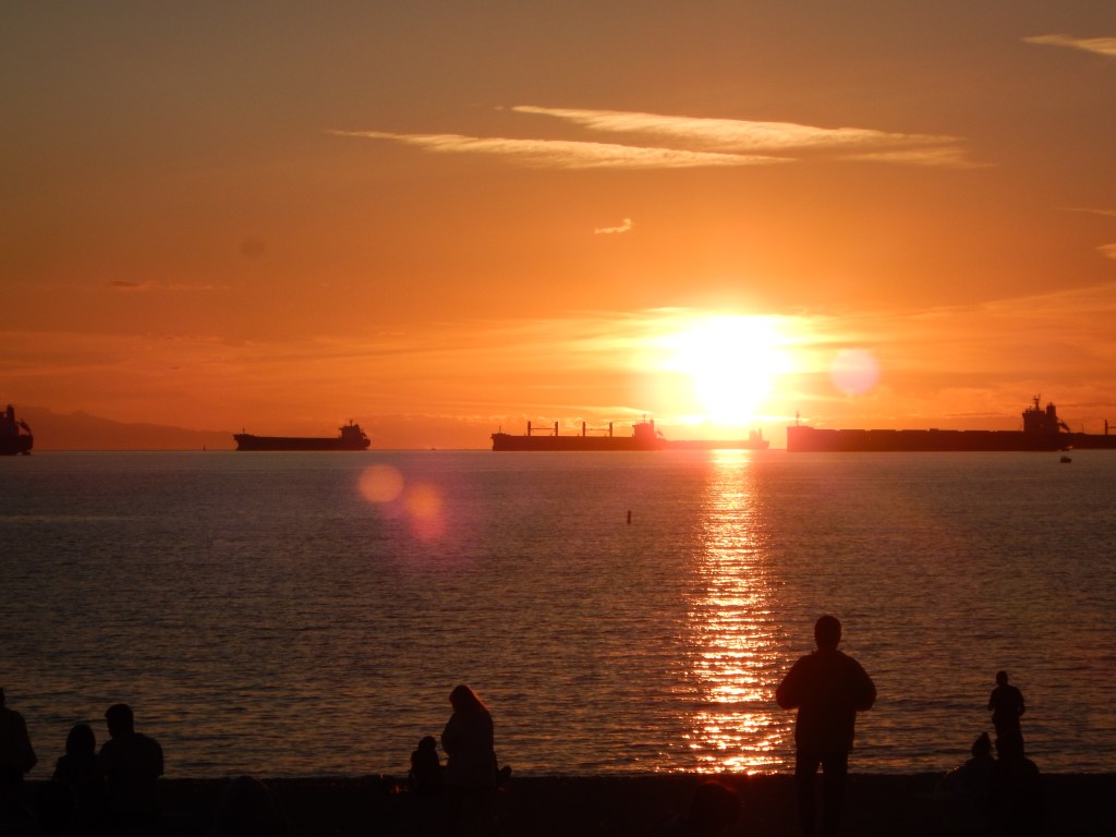 Da das Wetter heute so toll ist, bringen wir die Rucksäcke ins nahe Hotel, ziehen uns um und machen uns nochmal zu Fuß zur English Bay auf. Es sind nur 850m die Denman Street hinunter. Auf der Veranda des Restaurants „Hook“ essen wir zu Abend und setzen uns danach mit einem Getränk an den Strand, wo sich schon zahlreiche Menschen versammelt haben. Langsam und sehr malerisch versinkt die Sonne vor uns im Meer. Es ist schon dunkel als wir zum Hotel zurück schlendern. Alle Lokale sind gut besucht und man fühlt sich auch am Abend hier noch sehr sicher.