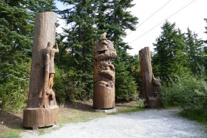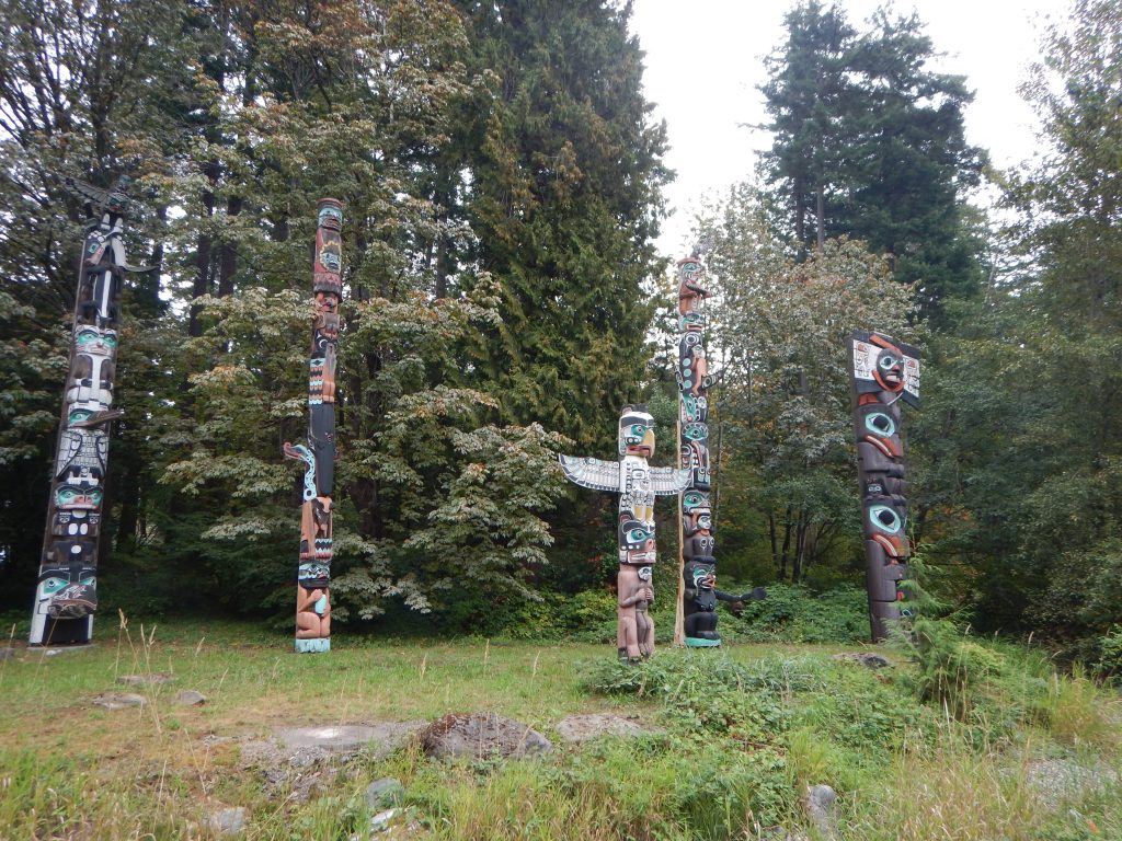 Also fahren wir weiter den Seawall entlang bis zum Brockton Point Totem Pole. Seit den 1920er Jahren hat die Stadt die Pfähle angekauft und wollte eigentlich ein First Nations Dorf errichten, was aber nicht vollendet wurde. Die ursprünglichen Pfähle fingen auch an zu verrotten, so dass man sie in Museen unterbrachte und durch Nachbildungen ersetzte. Auf den Hinweisschildern kann man nachlesen, zu welchem Stamm sie gehörten.