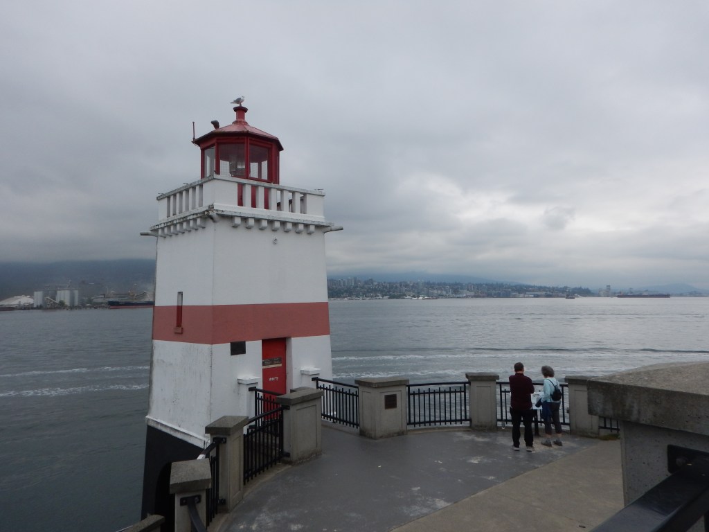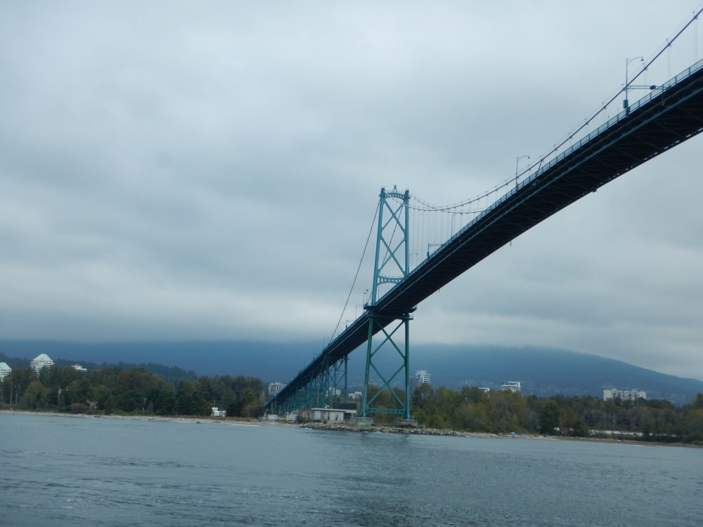 Wir passieren Lumberman’s Arch, ein Holzfällerdenkmal an der Stelle, wo früher einmal eine große indigene Siedlung stand, fahren unter der über 1500m langen Lions Gate Bridge mit seiner imposanten Stahlkonstruktion hindurch, bevor wir zum Prospekt Point Lighthouse kommen, einem historischen Leuchtturm. Von hier hat man einen schönen Blick auf die Brücke und auf Nord und West Vancouver und den Pazifik, der sich nach Westen erstreckt. Über diese Brücke kann man mit dem Auto zum Capilano Suspension Bridge Park fahren, wo man über einen Baumwipfelpfad und eine freihängende Brücke mit spektakulärem Blick nach unten laufen kann (recht teurer Eintritt) und zum Grouse Mountain.