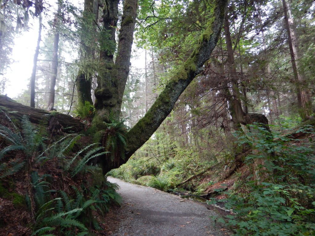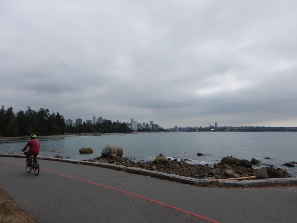 Um den Stanley Park herum, immer an der Küste entlang auf dem „Seawall“ ist ein 11 km langer hervorragender Radweg. Was ich super finde: man darf nur in eine Richtung fahren. Man kann also die Aussicht genießen ohne ständig entgegenkommenden Radlern ausweichen zu müssen. Für Fußgänger gibt es daneben einen Extraweg. Meist sind die beiden Spuren so gut voneinander getrennt, dass man auch zu Fuß keine Angst vor den Radfahrern haben muss. Ein tolles Konzept. Hier macht das Fahren echt Spaß. Die weniger frequentierten Wege im Innern des bewaldeten Parks müssen sich alle wieder in beiden Richtungen teilen. Man sollte dann nur auf der Karte nachschauen, wo man wieder auf den Küstenweg fahren muss, um in die gewünschte Richtung zu kommen. Sonst muss man eine Zusatzrunde fahren und das können einige Kilometer sein.