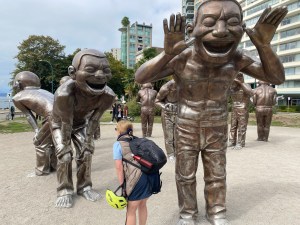 An der English Bay setzen wir uns mit einem Kaffee von Starbucks auf eine Bank- es ist ein so schöner Platz hier. Sehenswert ist die Gruppe von 14 lustigen Skulpturen, die hier stehen, „The A-Maze-Ing Laughter art work“. Alle sind ein Selbstporträt des Künstlers Yue Minjun. Ursprünglich waren sie Teil der Vancouver Biennale 2009-2011, bei der alle zwei Jahre zeitgenössische Kunst im Freien ausgestellt wird.